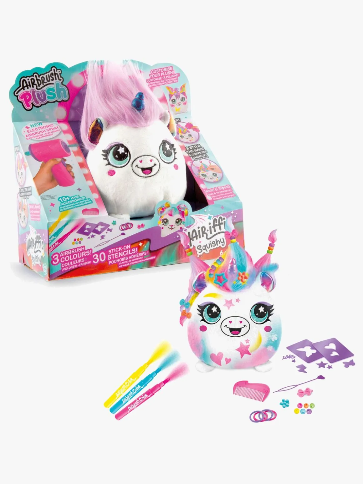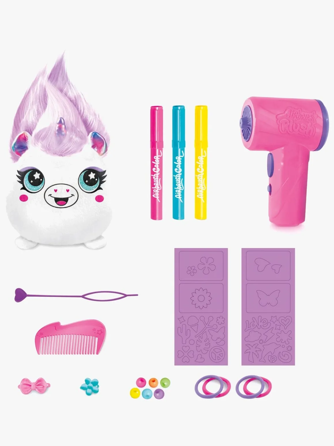 – Indeholder: 1 bamse, 1 airbrush-værktøj, 30 klistermærkeskabeloner, 3 airbrush-tusser, 10 hårtilbehør.