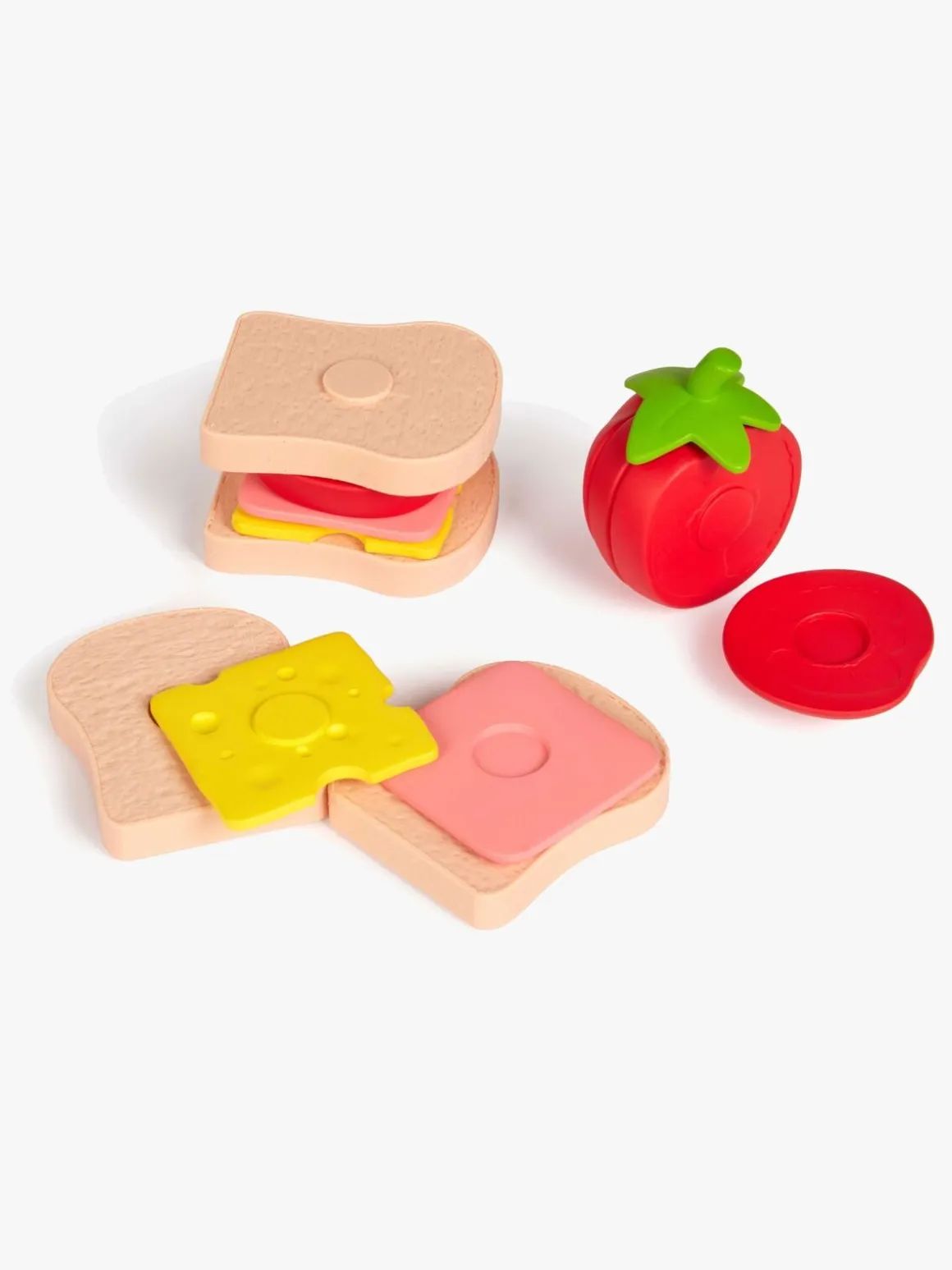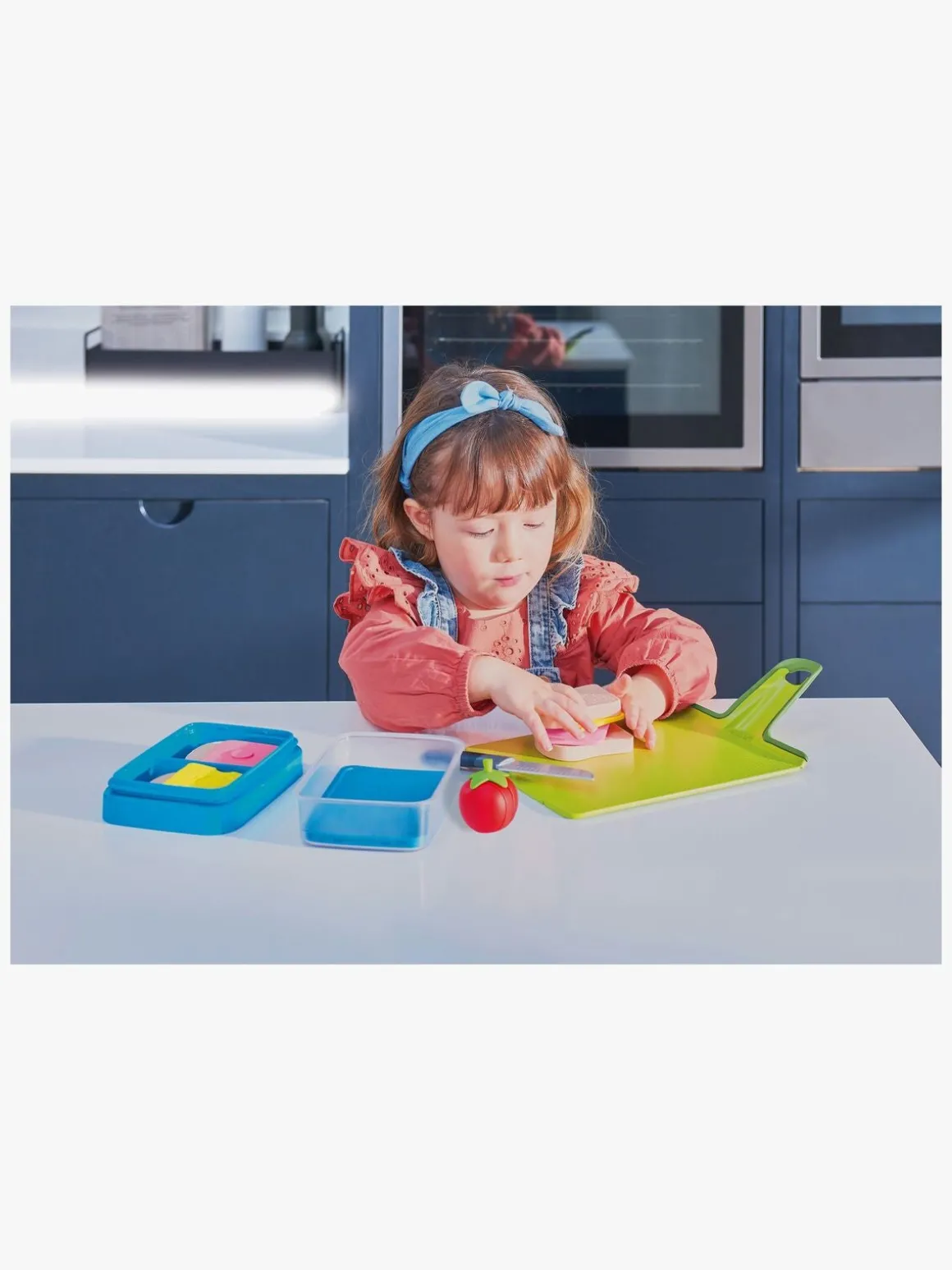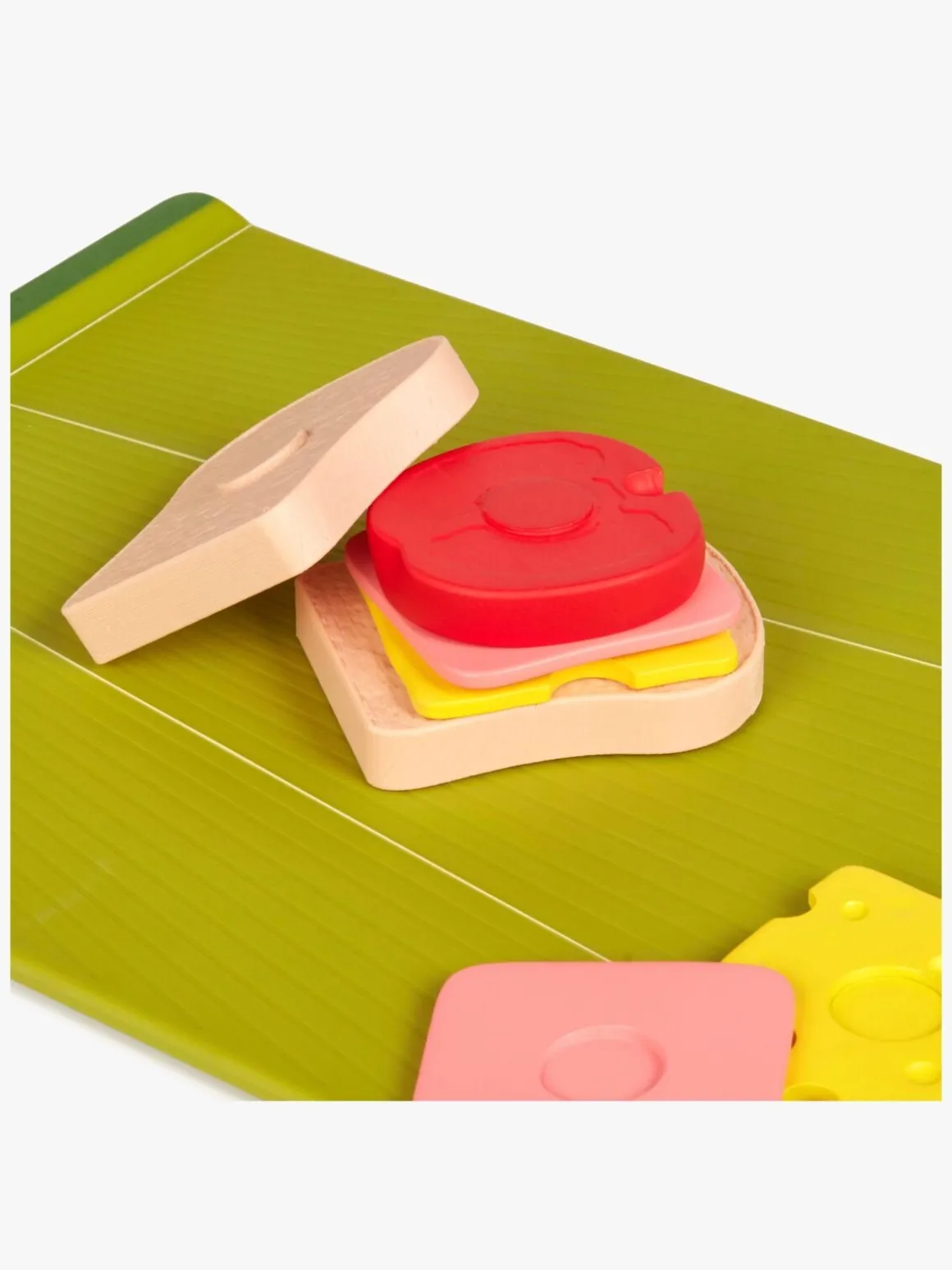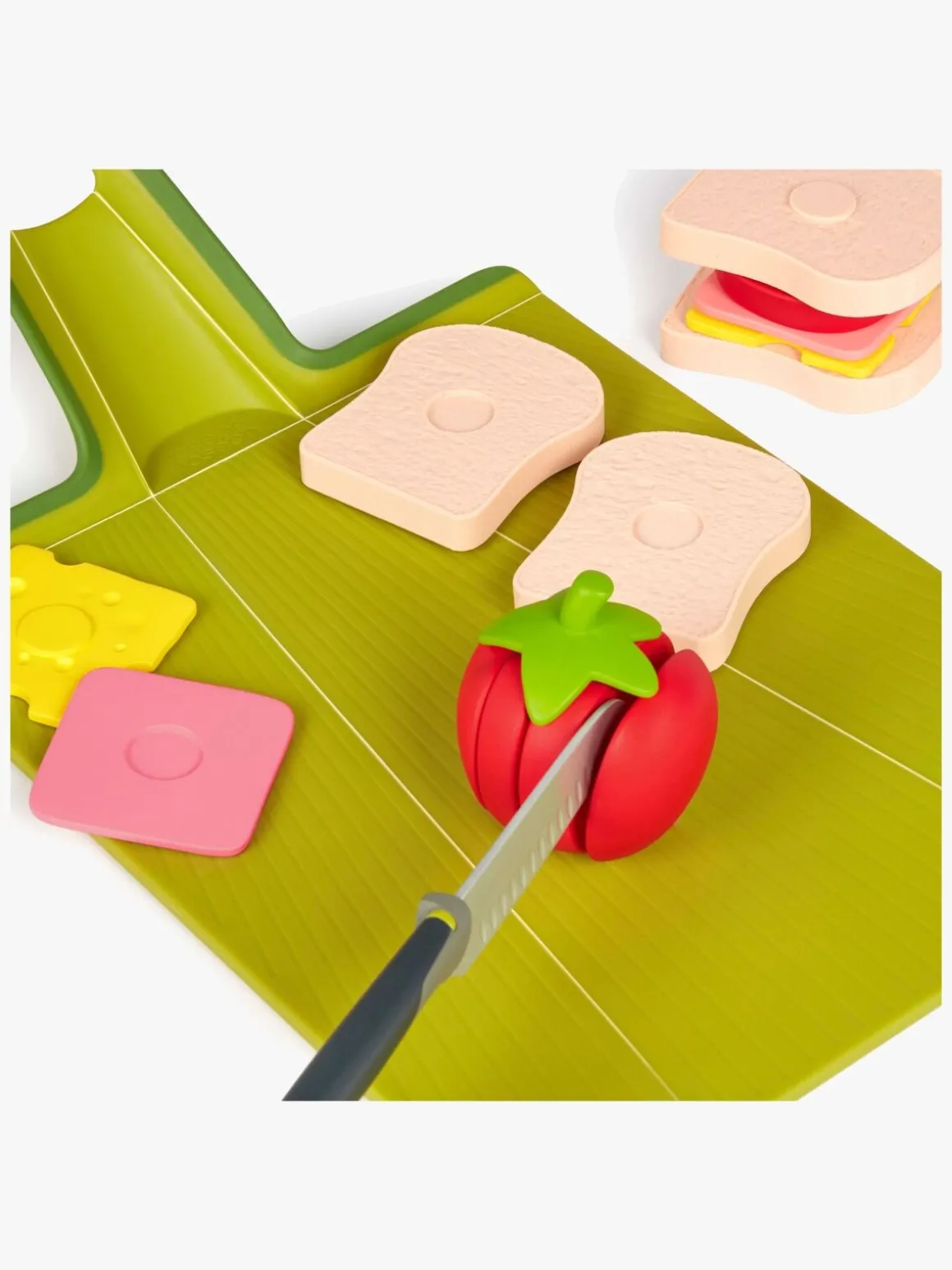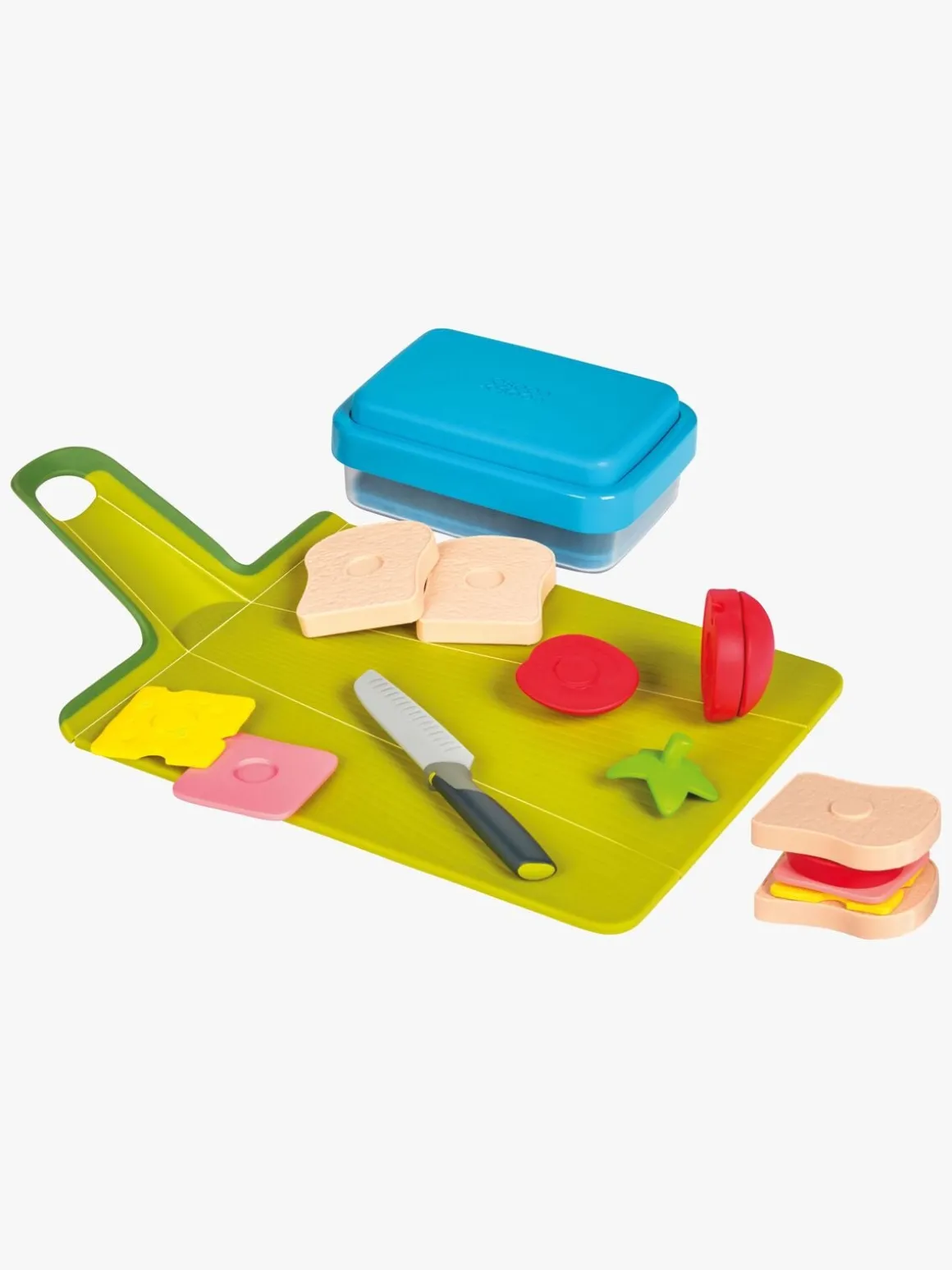 – Indeholder: 1 skærebræt, 1 legetøjskniv, 13 ingredienser, 1 madkasse.