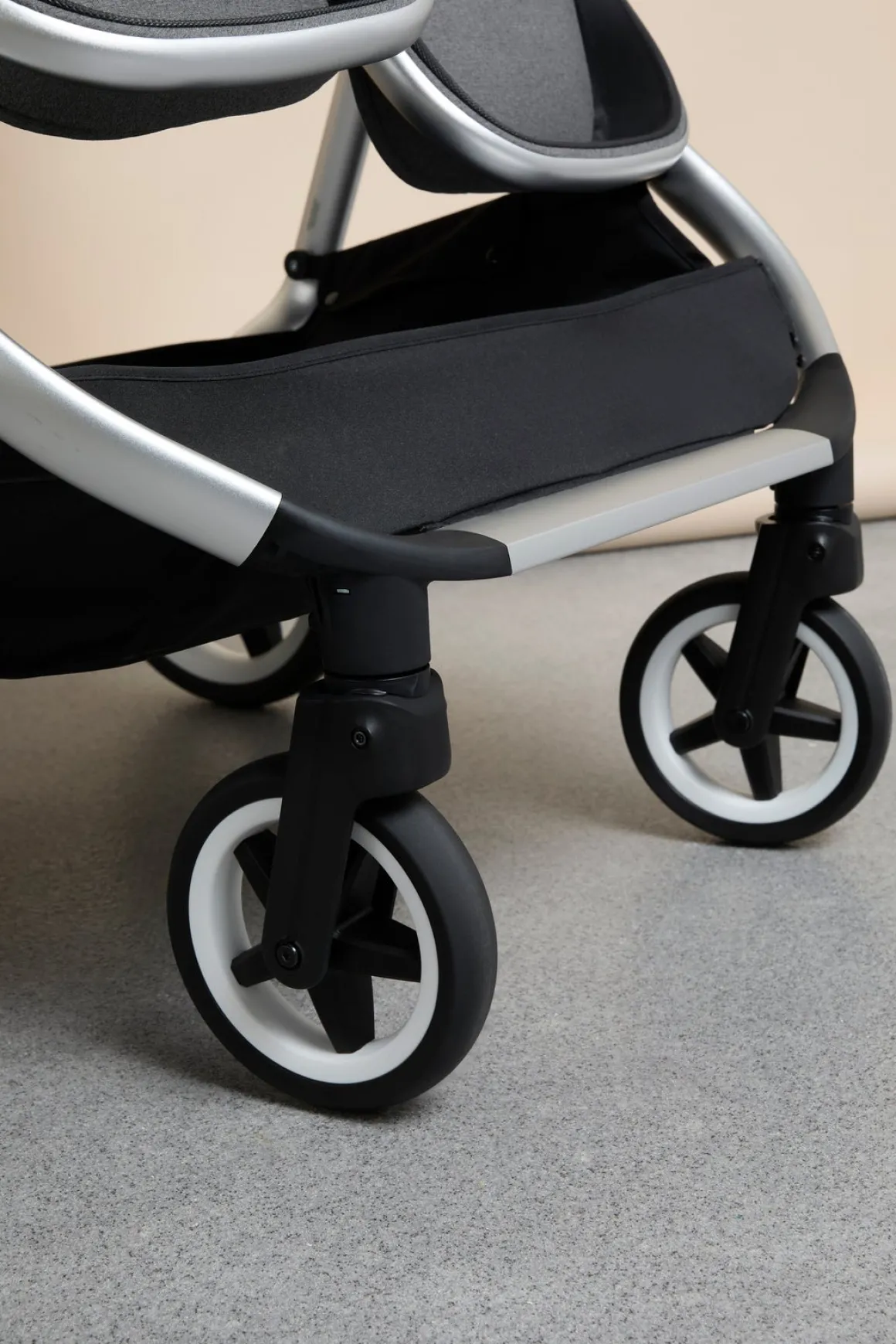 Selv teleskophåndtaget er dækket af behageligt, imiteret læder og det kan justeres så det passer til personen, der kører vognen. Der er fodbremse og en stor opbevaringskurv under vognen. Stellet har fire punkteringsfrie EVA-hjul, hvoraf de to forreste kan låses. Du kan tilkøbe lufthjul (sælges separat).