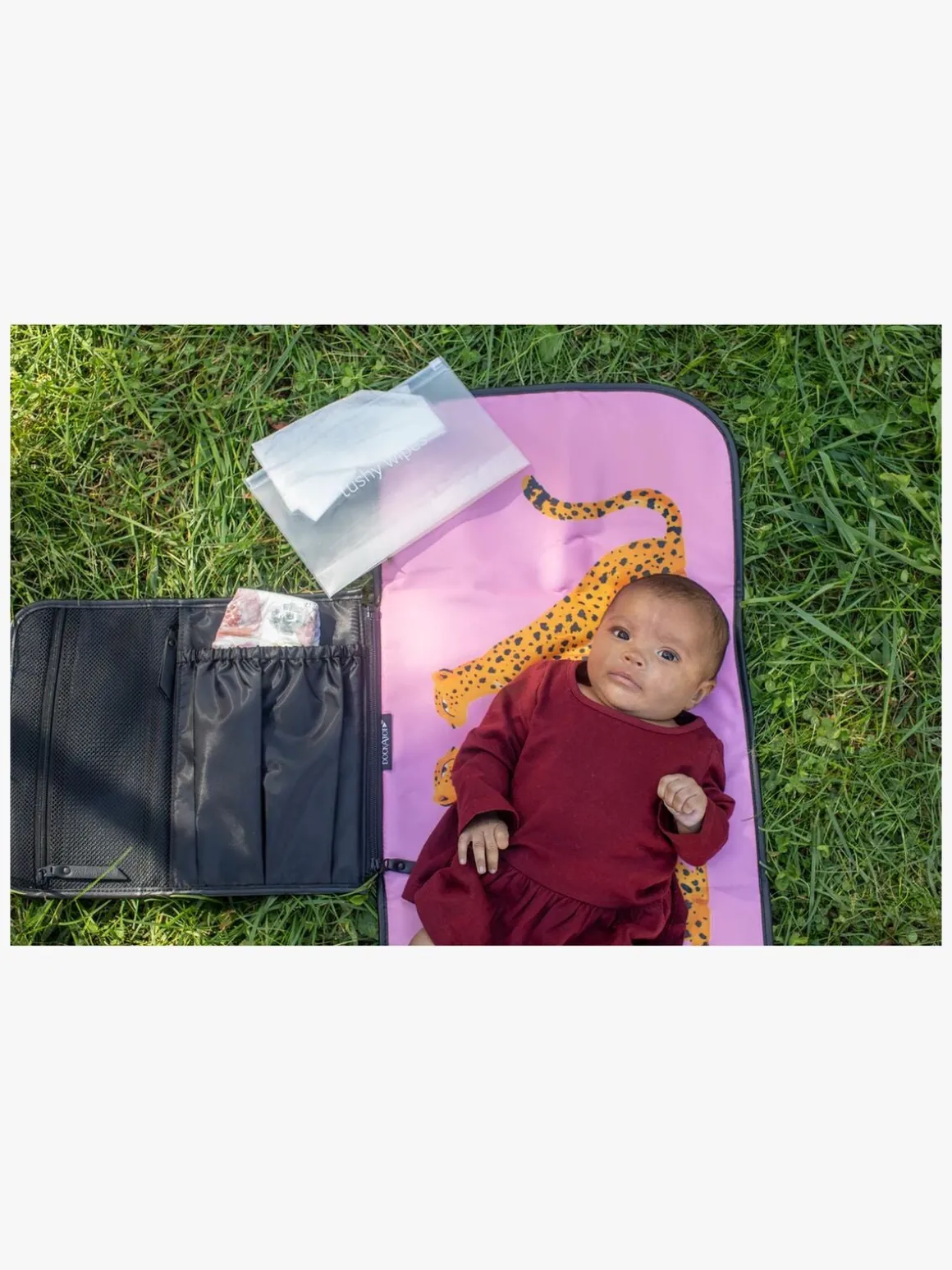 – 1 udvendig lomme med lynlås, 1 åben indvendig lomme til bleer og 2 indvendige lommer med lynlås.
