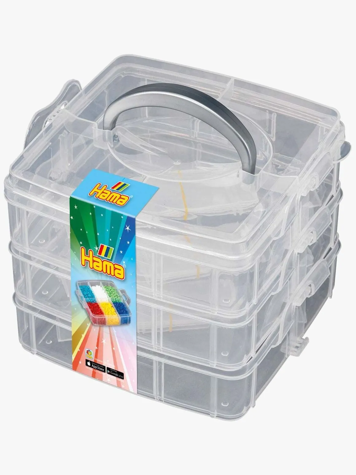 Opbevaringskasse i plastik fra Hama. Kassen er udstyret med håndtag og opbygget af 3 lag med justerbare vægge, så du selv kan indrette de forskellige rum. Perfekt kasse til at opbevare dine perler i!
