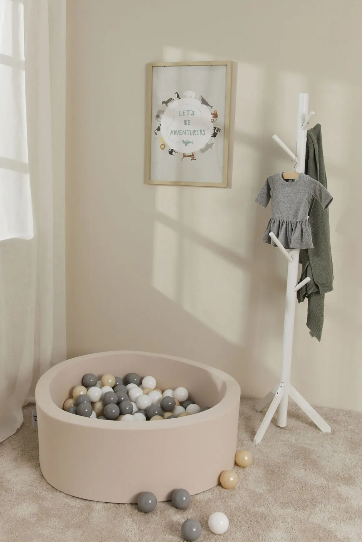 Dette skønne boldbassin er beklædt i blød, Oeko-Tex-certificeret bomuld og er fyldt med 150 bolde, der er fremstillet af giftfri PE-plast. Boldene kommer i farverne hvid, grå og metallisk beige. Betrækket kan tages af og vaskes i maskinen, så du let kan fjerne pletter, hvis uheldet skulle være ude.