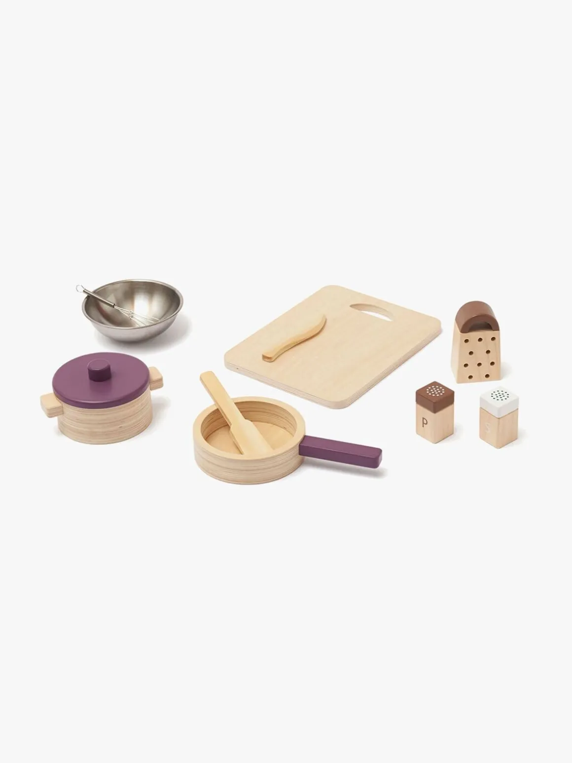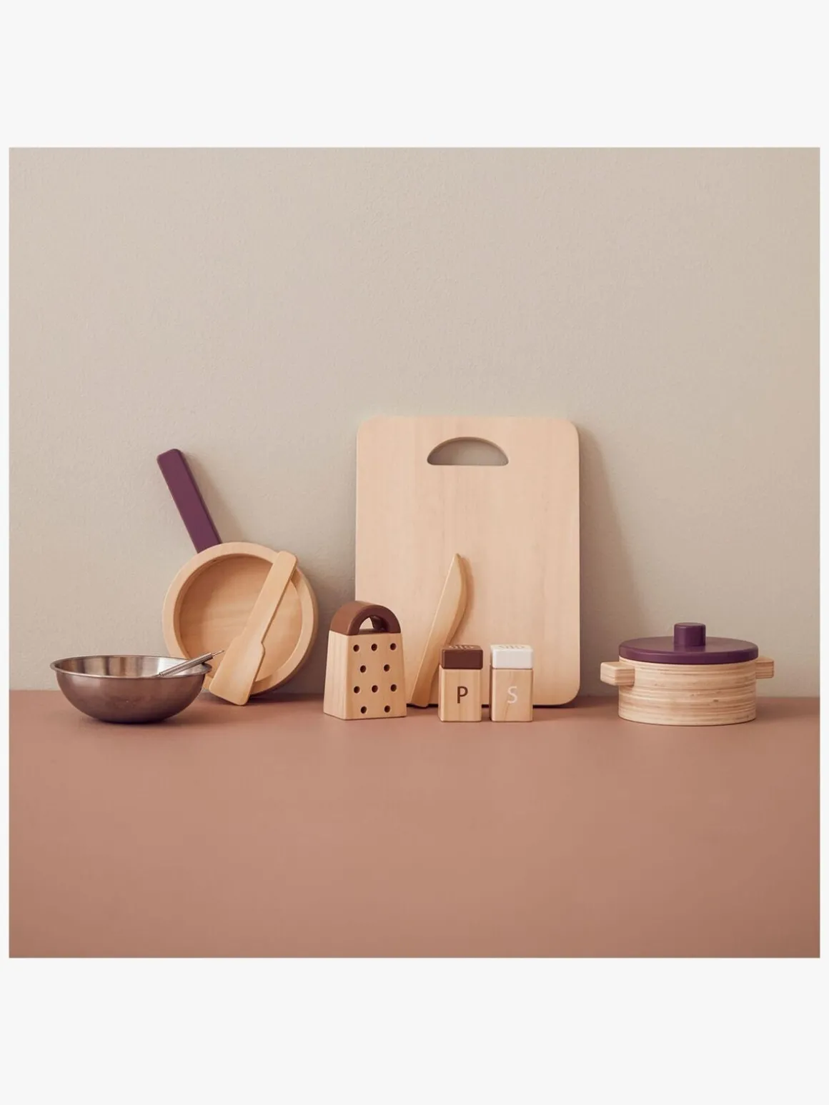 | Øvrige mål | Gryde m. låg: 14x12x8 cm. Stegepande: 21,5x13x3,5 cm. Skål: 13x13x4 cm. Skærebræt: 24×18.5×1 cm. Rivejern: 5,5×4.5×9 cm. Bestik: 13 cm Salt & peber: 3,5×3,5×6 cm. |