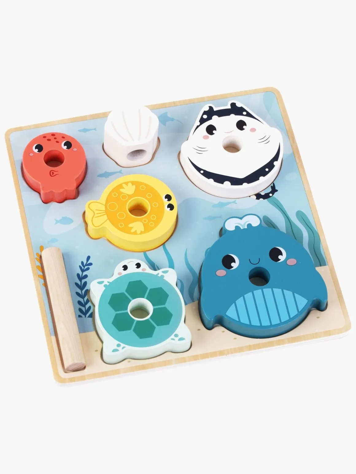 – Indeholder: 6 brikker med huller i midten og en træpind til at stable dem på.