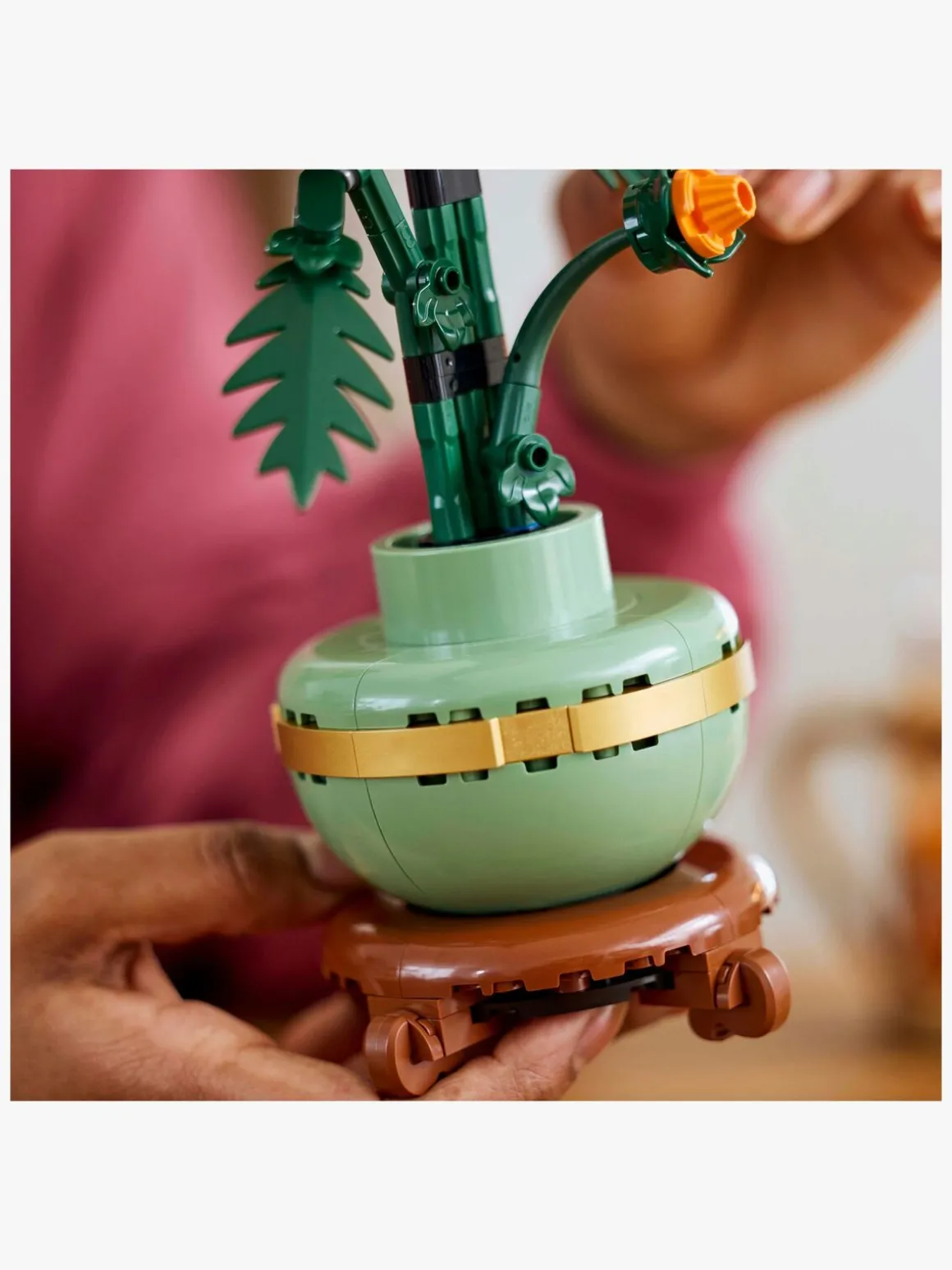 Den detaljerede gengivelse med poserbare blade og kronblade indfanger den flotte orange blomst i knop, blomstrende og i fuldt flor og omfatter en pastelgrøn urtepotte dekoreret med et gyldent bånd og stående på en sokkel med træeffekt. Krysantemumplanten er nem at samle, vil være et elegant midtpunkt i ethvert rum og kan udstilles sammen med andre sæt fra den botaniske LEGO samling sælges separat.