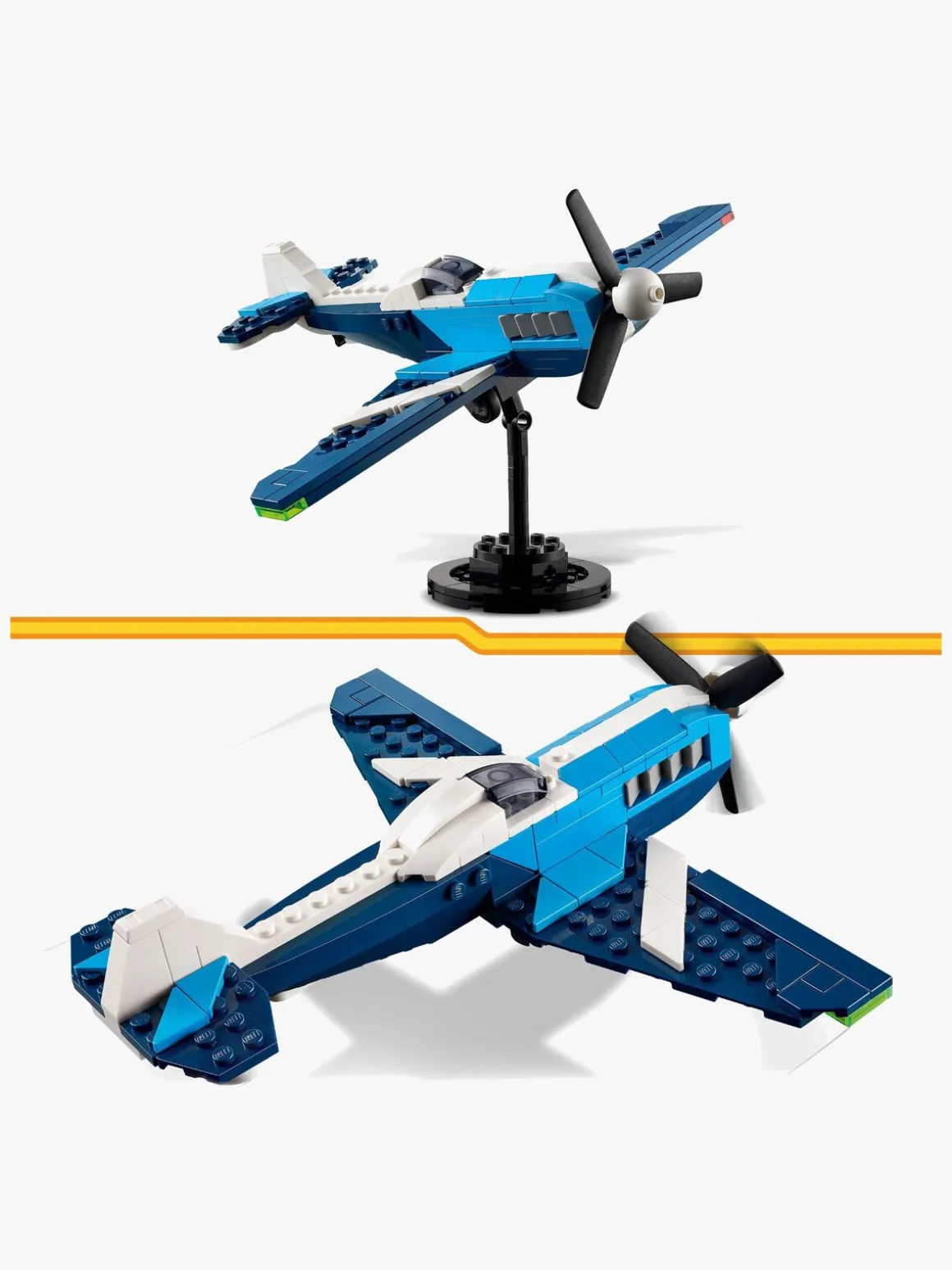 Børn kan vælge at bygge 3 forskellige fantastiske fartøjer: et legetøjsfly med drejelig propel og bevægelige hjul; et legetøjsjetfly med bevægelige hjul og en helikoptermodel med drejeligt rotorblad. Hver model kan udstilles på en klodsbygget stand, og sættet er en imponerende gave til børn, der kan lide at udspille fantasifulde, actionfyldte historier.