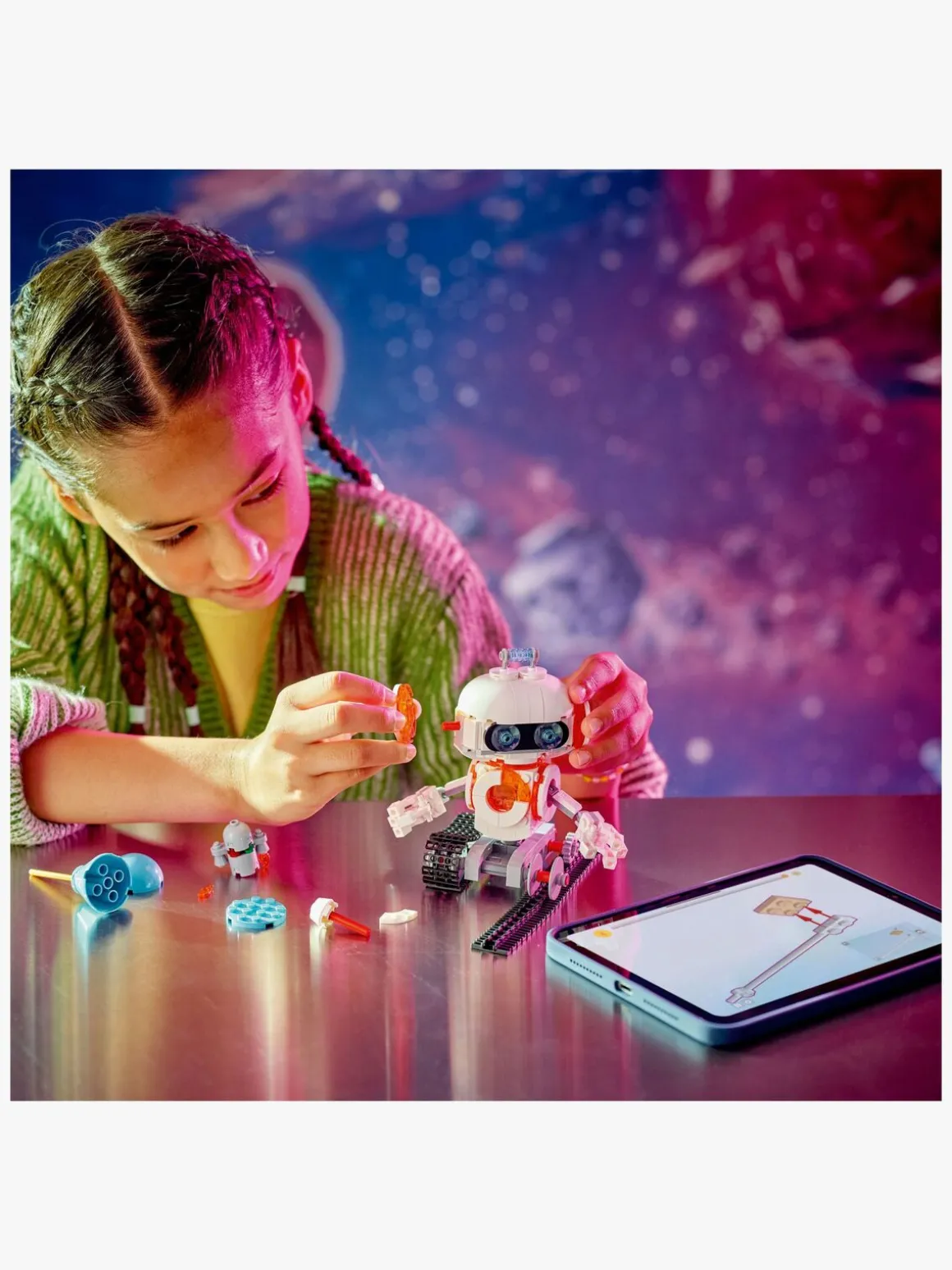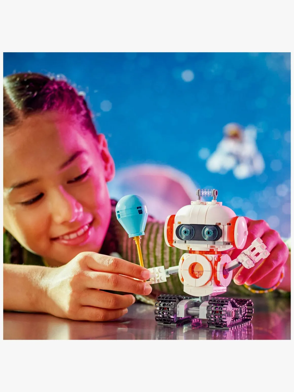 LEGO fans kan bygge og ombygge 3 forskellige actionfyldte rumbyggesæt med de samme klodser: en robot på bevægelige larvefødder, en bevægelig figur af en rumhund med kødben og frisbee eller en rumraket. Alle 3 modeller er seje gaver med rumtema til leg og udstilling, og de lyser, når børn trykker på en lysklods batterier medfølger.
