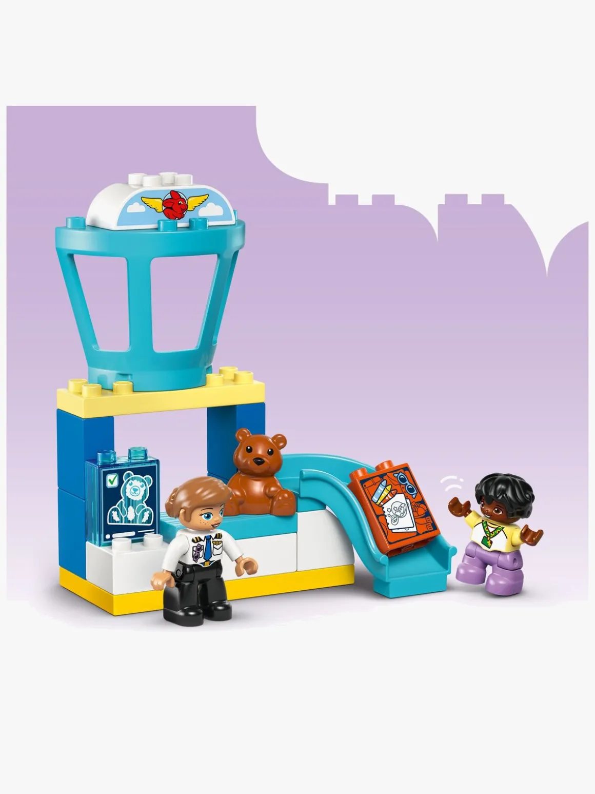 LEGO DUPLO lufthavnssættet har masser af detaljer, der sætter gang i fantasifuld leg. Det omfatter en sikkerhedskontrol-skranke til børns rolleleg med at scanne kufferten og skubbe den ned ad slisken, et kontroltårn og et bevægeligt legetøjsfly, der passer til figurerne af bamsen, barnet og piloten.