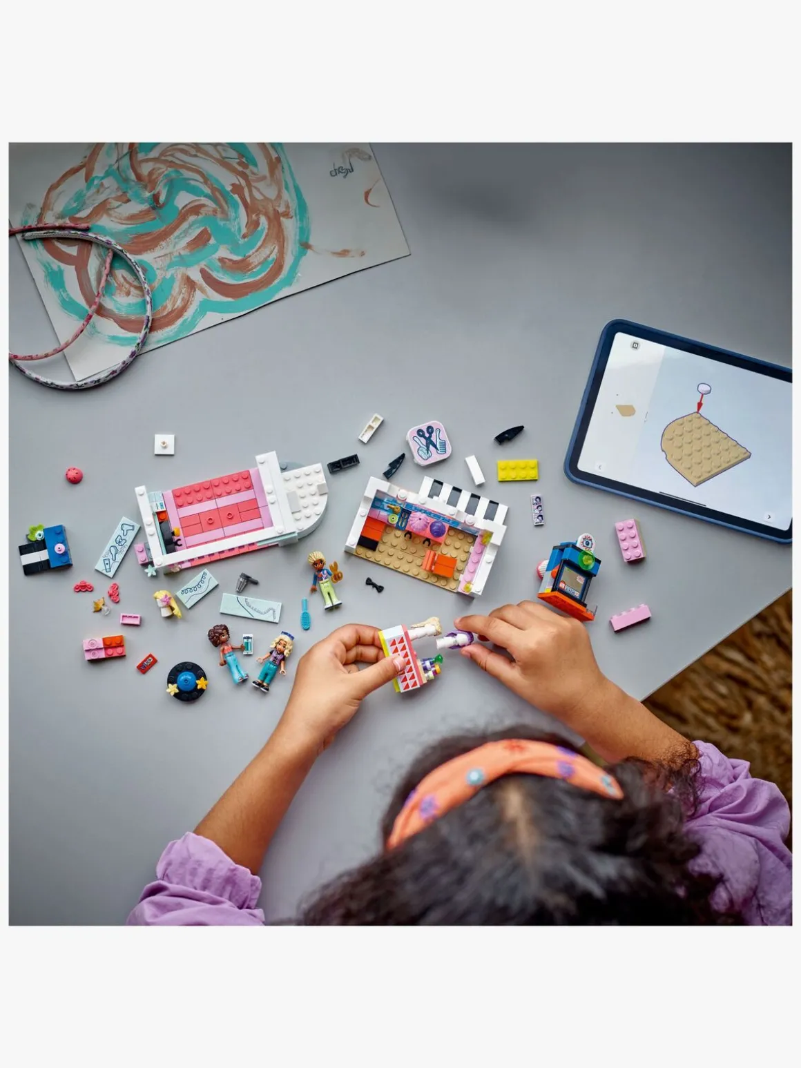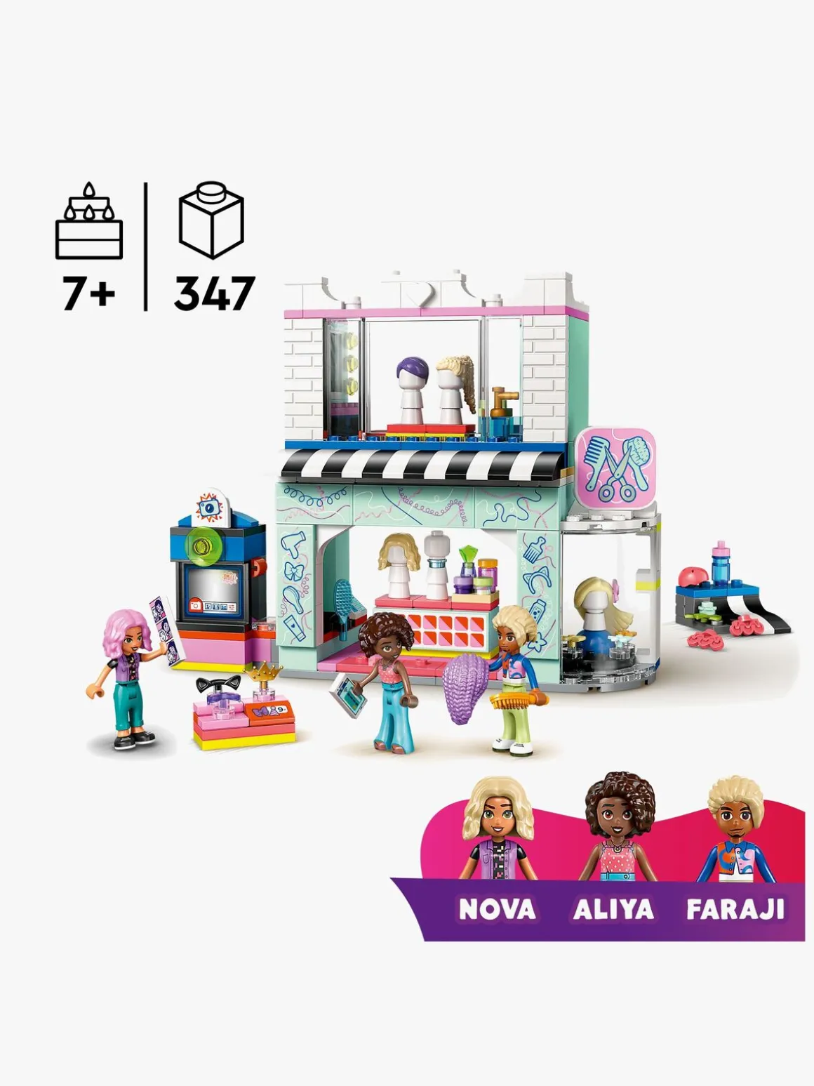 Byg-selv-sættet fortæller historien om vennerne Nova og Aliya, som har en sjov dag med at prøve nye stilarter med hårstylisten Faraji. Den 2-etagers bygning har en frisørsalon ovenpå med frisørstole, hårtørrere, børster og parykker, som figurerne kan prøve. Nedenunder er der en accessories-butik med flere hårelementer og sjovt tilbehør til at fuldende figurernes nye looks. Børn kan sætte figurerne i fotoautomaten og se billederne af Aliya og Nova, der kommer ud. Legetøjssættet indeholder også en roterende vinduesudstilling samt en skaterrampe med tilbehør i form af rulleskøjter og hjelm.