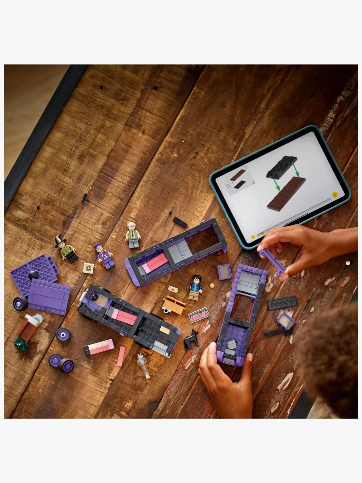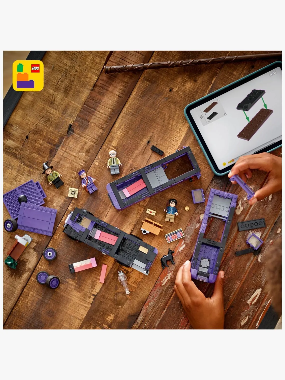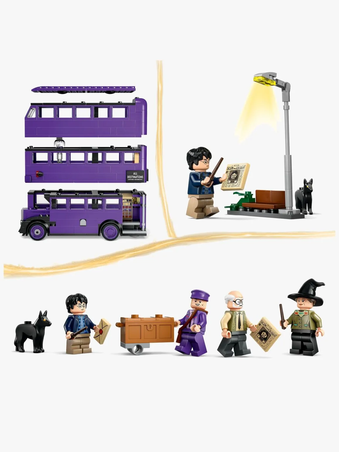 Det magiske byggelegetøj indeholder også 5 LEGO Harry Potter figurer – Harry Potter, Ernie Kabang, Stan Stabejs, en sovende heks samt Køter – til at genskabe genkendelige scener fra Harry Potter og Fangen fra Azkaban. Andre autentiske detaljer, bl.a. en byggemodel af lygtepælen, hvor Harry ventede og blev skræmt af Køter!, før Natbussen ankom, Harrys kuffert og et element af avisen Profettidende med overskriften “Escape from Azkaban” bidrager til de kreative muligheder for rolleleg.