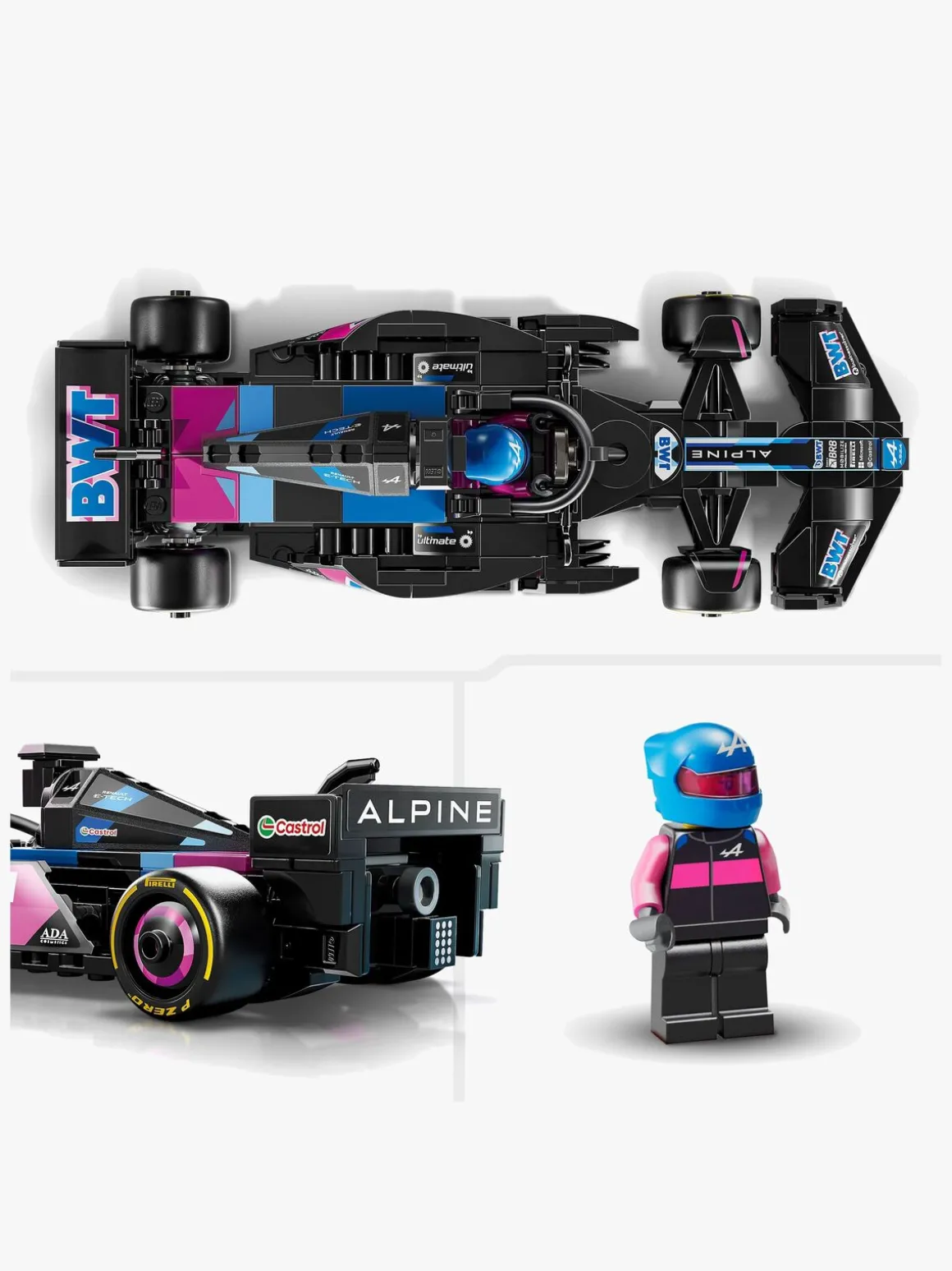 F1-modelbilen har cockpit, der åbnes ved at løfte sikkerhedsbøjlen, bagvinge, wishbone-affjedring, sponsorklistermærker og bredere bagdæk med “Pirelli” påtrykt. Sættet med racerbil omfatter også en minifigur af en kører iført Alpine-dragt og hjelm med vinge. Køreren kan anbringes i cockpittet.