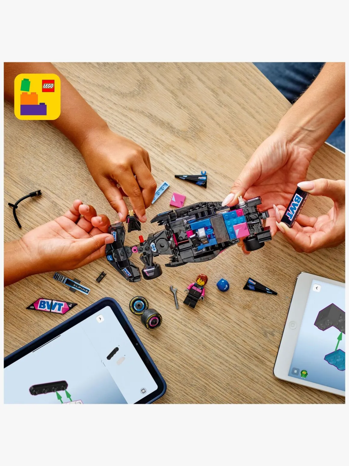 — Indeholder en minifigur af en Alpine-kører, der kan sættes i cockpittet til rolleleg