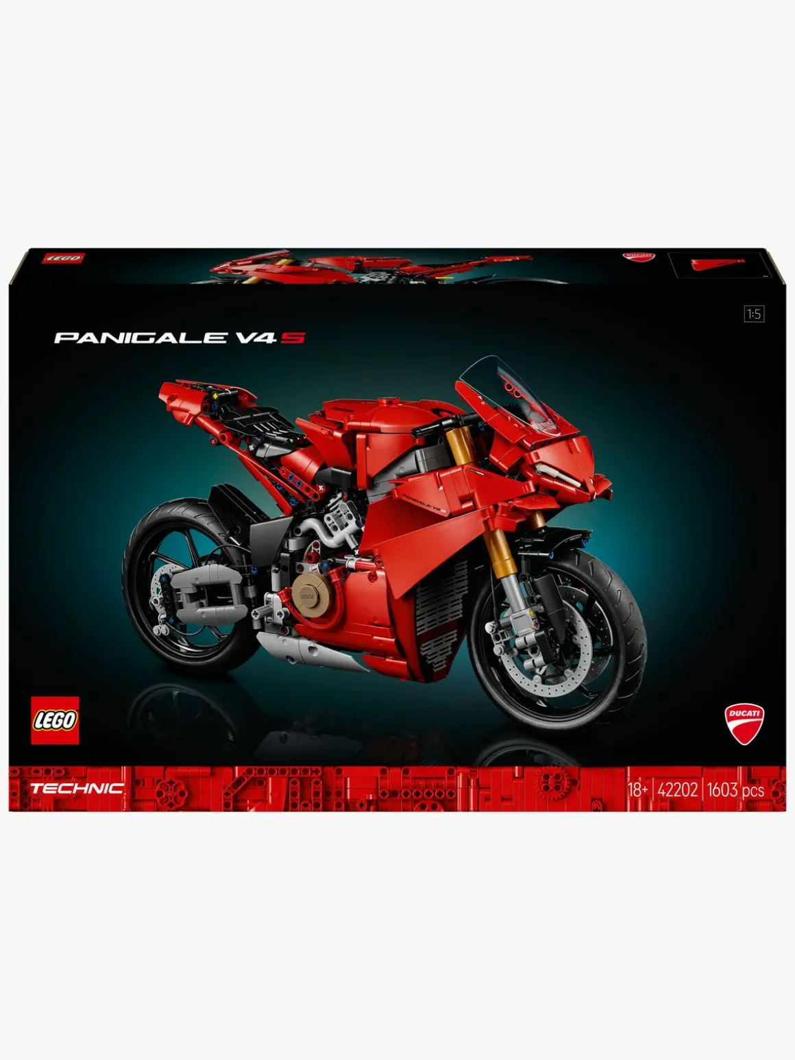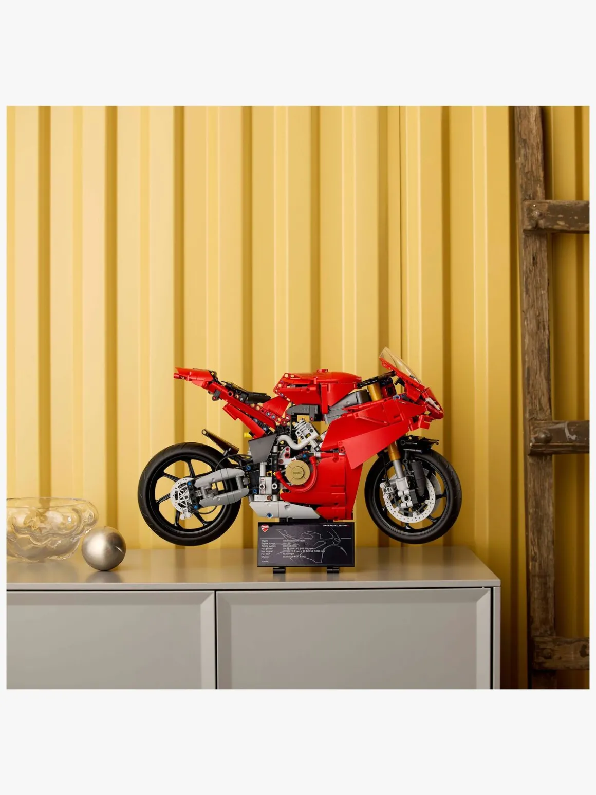 Udforsk for- og baghjulsaffjedringen og styret. Tjek pedalgearskiftet med 3-trins samt frigear gearkasse. Brug baghjulet til at drive kæden, som er forbundet med gearkassen og V4-motoren. Med sin ikoniske røde Ducati-farve er denne model af en motorcykel en fantastisk gaveidé til motorcykelfans. Den omfatter en stand, som gør den til en iøjnefaldende udstillingsgenstand.