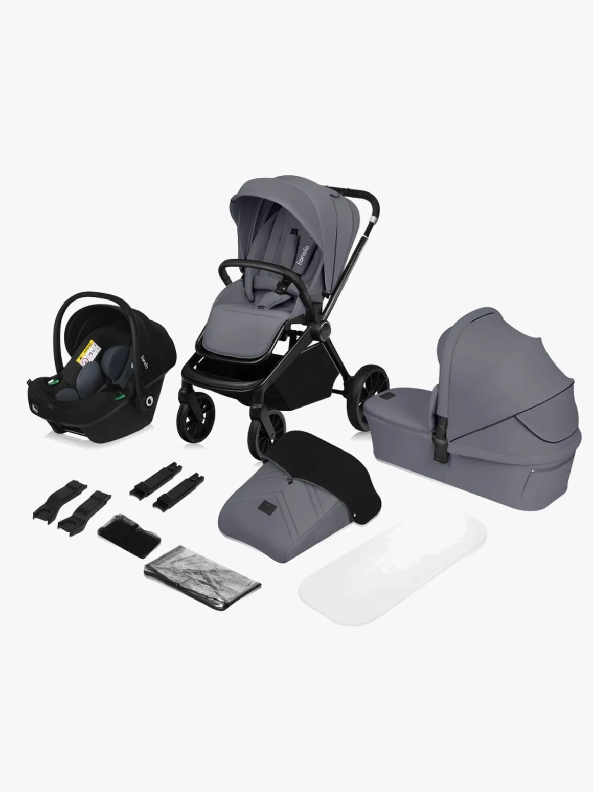 – Indeholder: 1 klapvogn, 1 liggedel, 1 i-Size-godkendt babyautostol, 1 myggenet, 1 regnslag, 1 adapter, 1 kørepose.