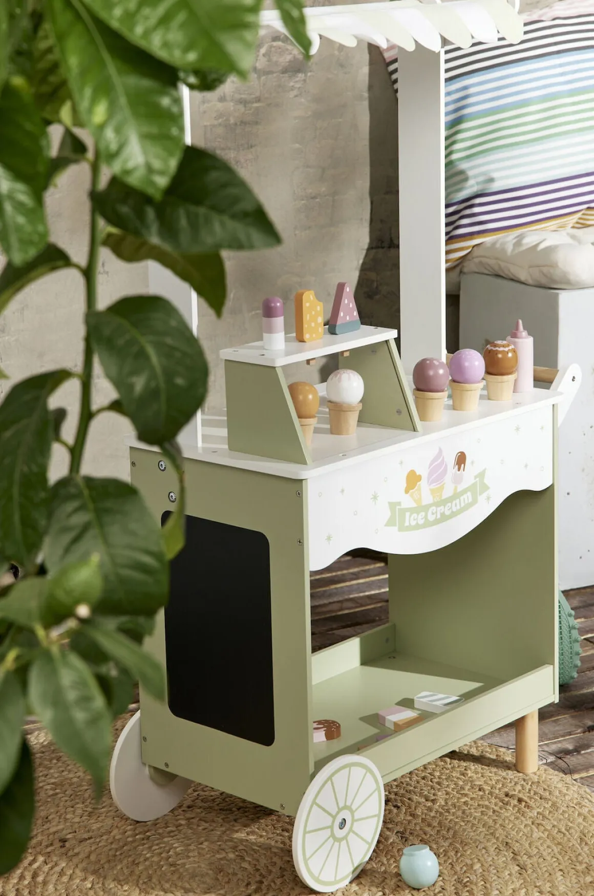 – Indeholder en isvogn med flere forskellige slags iskugler, vafler, pindeis, jordbærtopping og en isske.