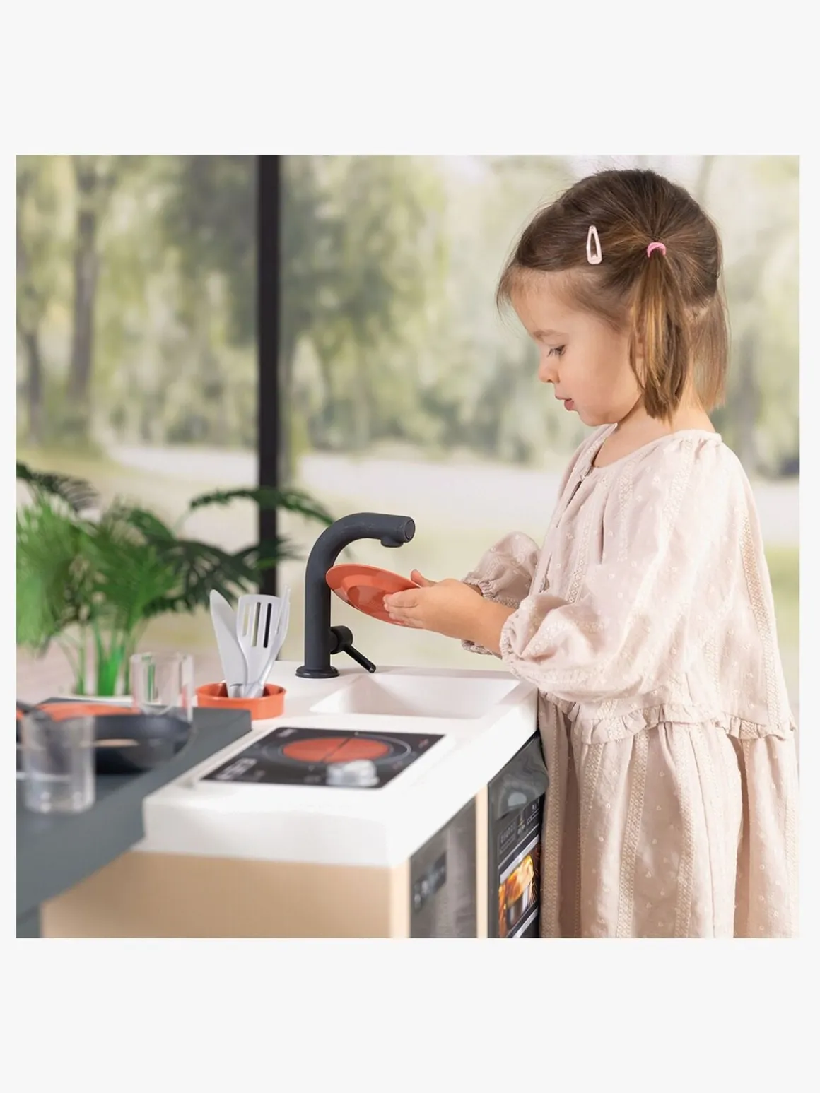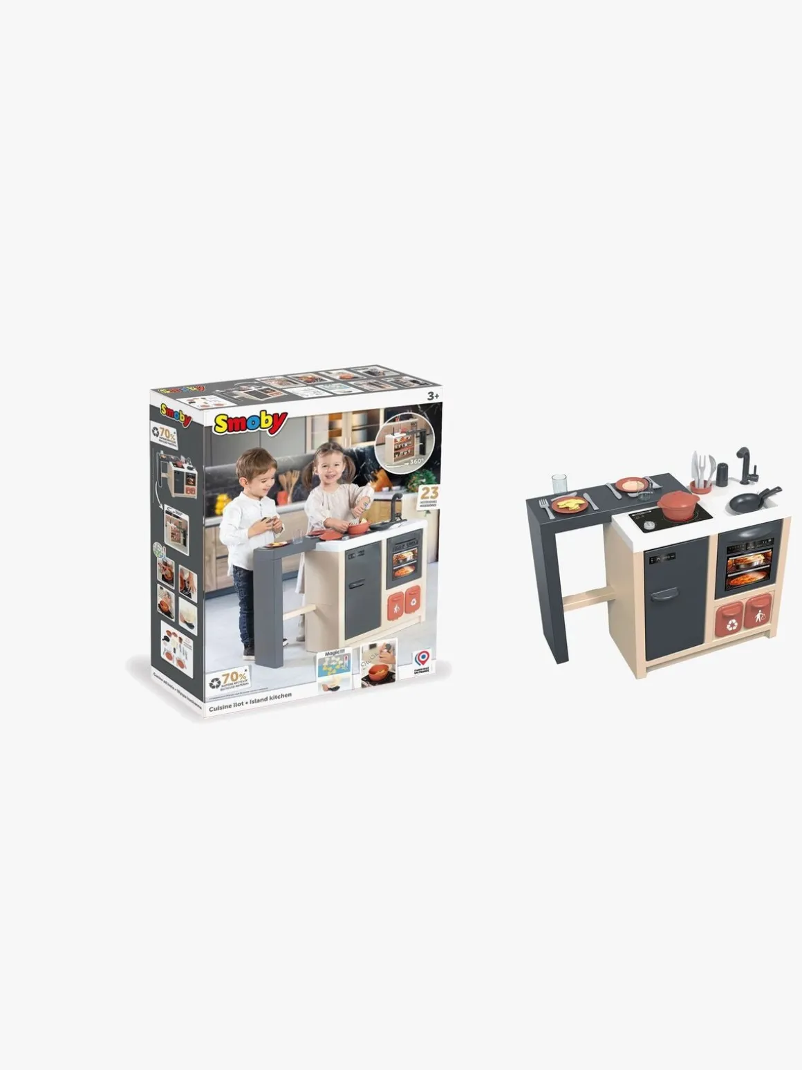 – Indeholder: 1 komfur, 1 ovn, 1 køleskab, 1 køkkenvask, 1 udtrækkelig spiseplads, 2 beholdere, 1 hylde, 23 tilbehør.