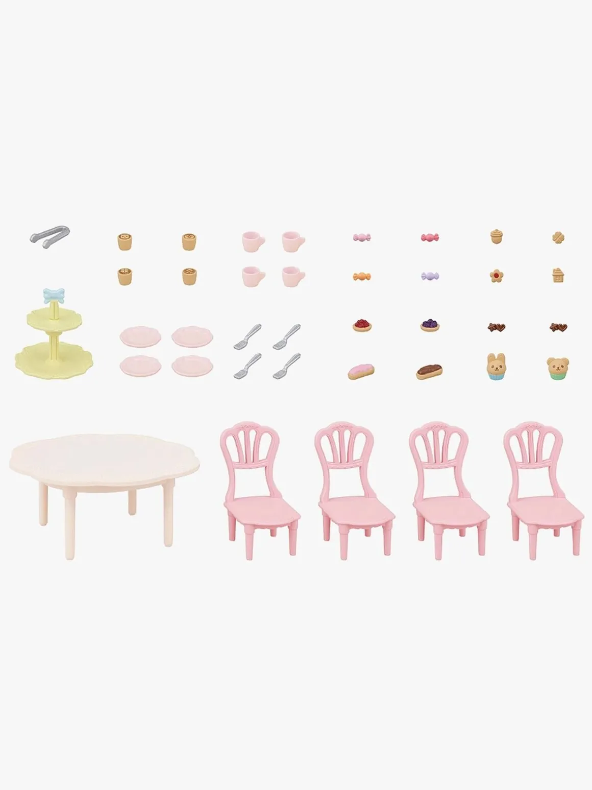– Indeholder: 1 bord, 4 stole, 1 kagefad, 4 tallerkener, 4 gafler, 4 kaffekopper, 4 kaffer, 1 tang, 16 kager og søde sager.