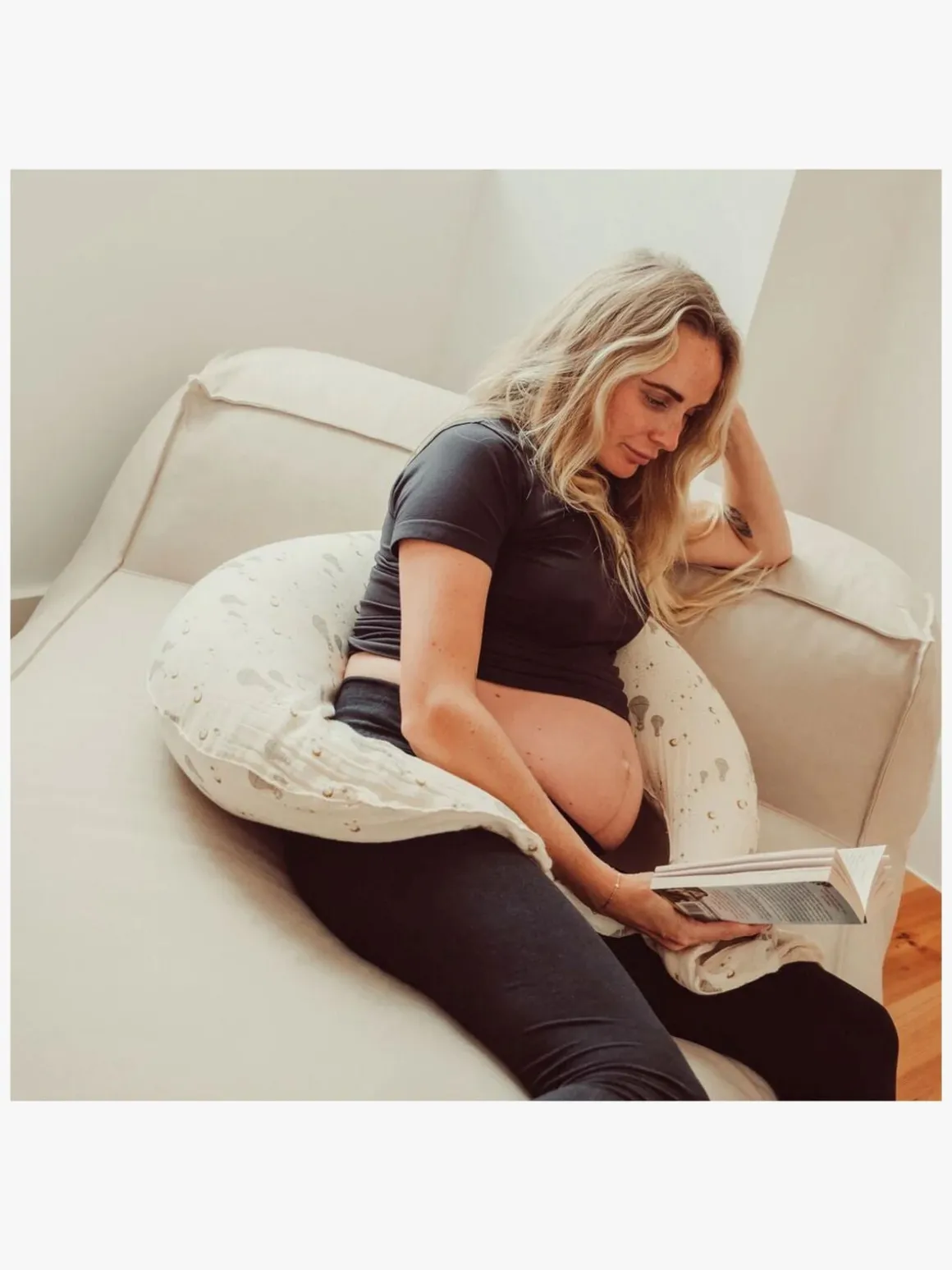 – Ekstra lange ender, der kan bindes sammen for at skabe et hyggeligt sted at sidde eller rundt om livet for optimal amme-komfort.