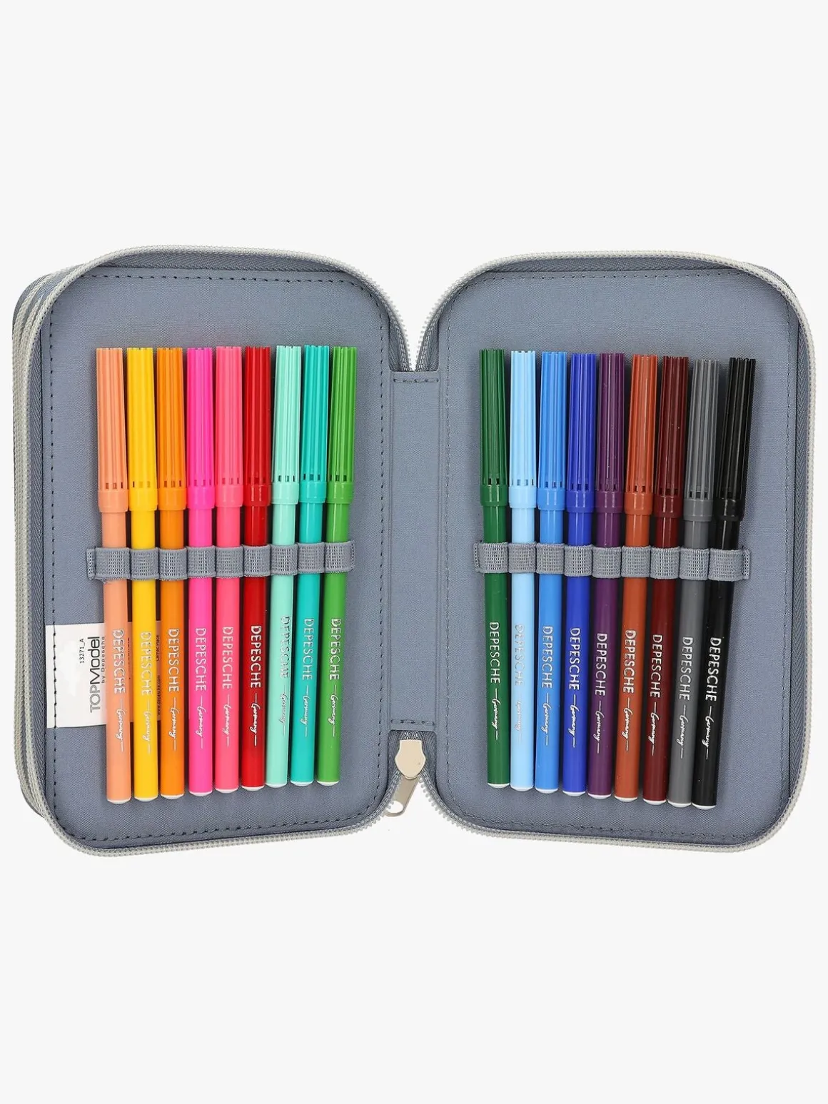 – Indeholder: 1 penalhus, 18 farveblyanter, 18 tusser, 2 blyanter, 1 saks, 1 limstift, 1 blyantspidser, 1 lineal, 1 viskelæder.