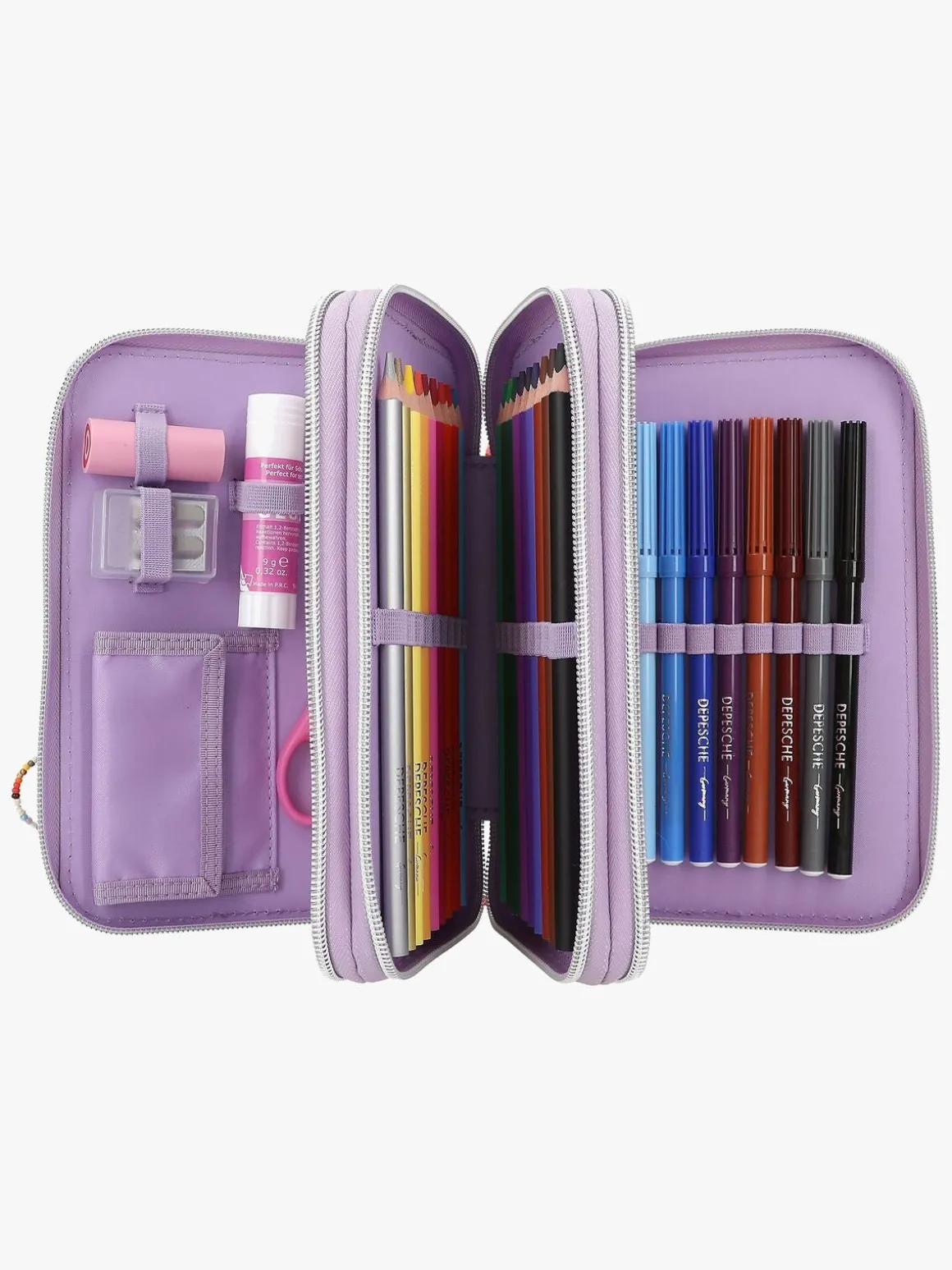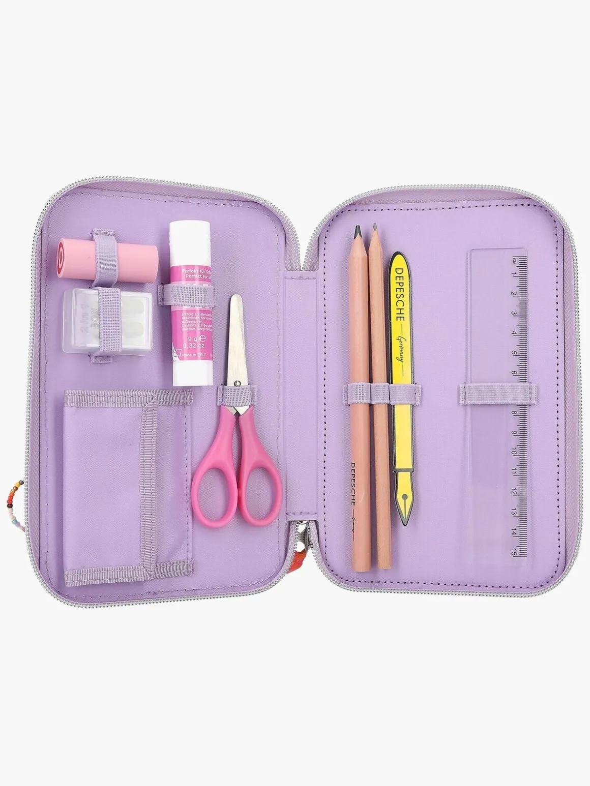 – Indeholder: 1 penalhus, 18 farveblyanter, 18 tusser, 2 blyanter, 1 saks, 1 limstift, 1 blyantspidser, 1 lineal, 1 viskelæder.