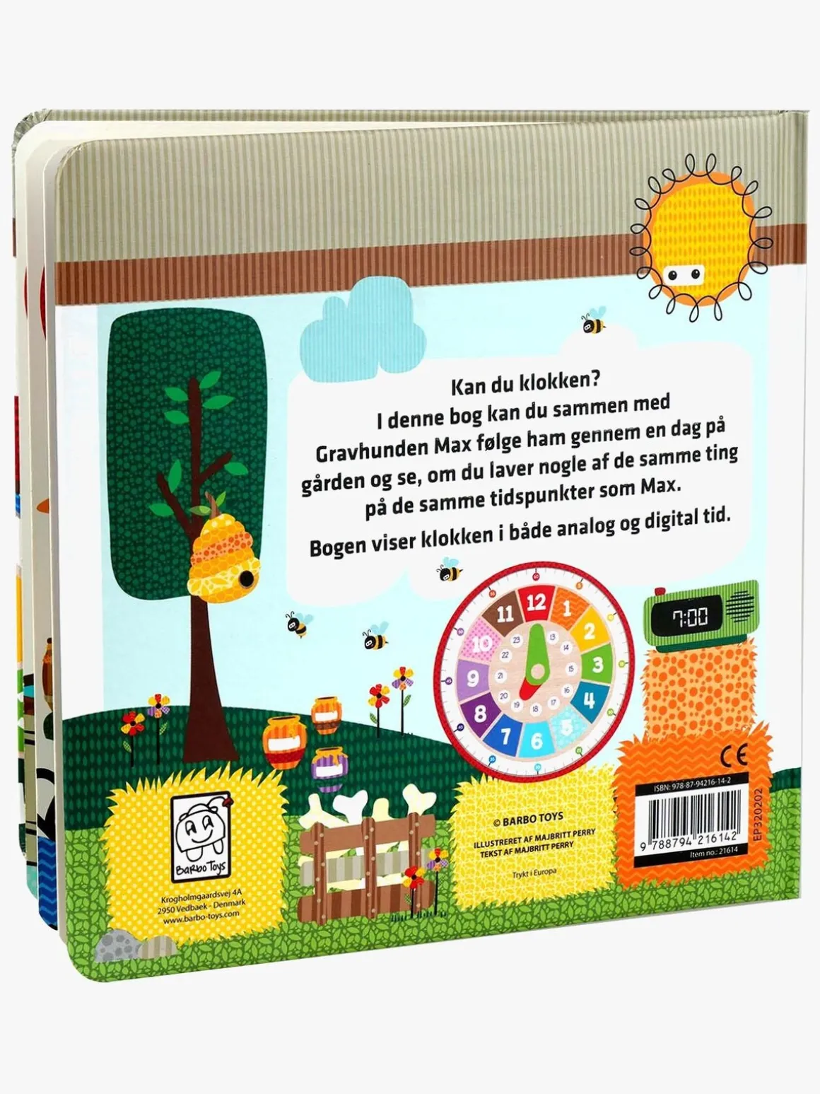 Kan du klokken? I denne bog kan du sammen med Gravhunden Max følge ham gennem en dag på gården og se, om du laver nogle af de samme ting på de samme tidspunkter som Max. Bogen viser klokken i både analog og digital tid. Barbo Toys’ produkter er designet med omsorg i Danmark og med fokus på bæredygtighed og materialer af høj kvalitet. Produkterne er designet og fremstillet efter filosofien “lær gennem leg” og understøtter og stimulerer aktivt barnets fantasi og læringsudvikling.