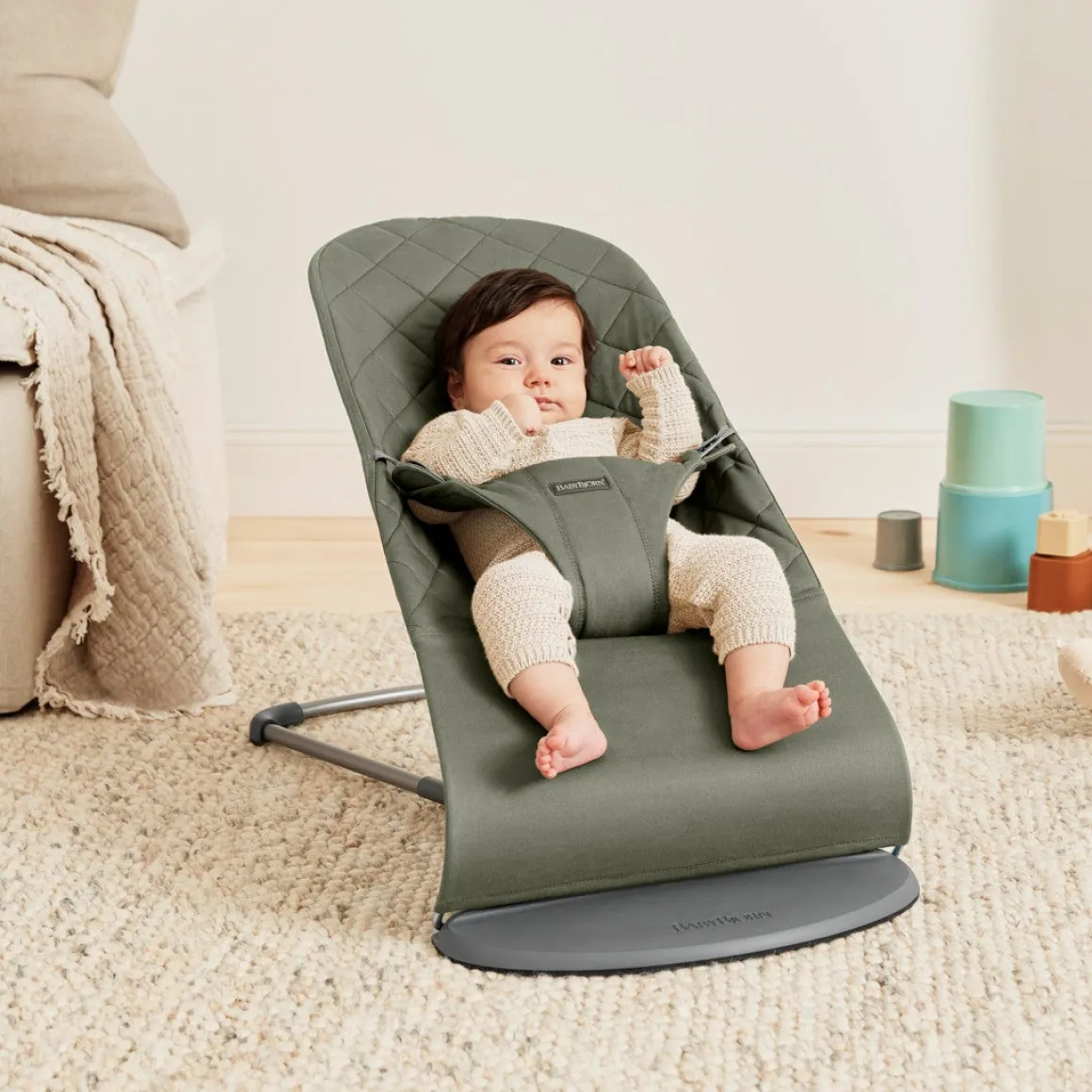 – Når barnet kan sidde uden støtte, kan skråstolen laves om til en stol.