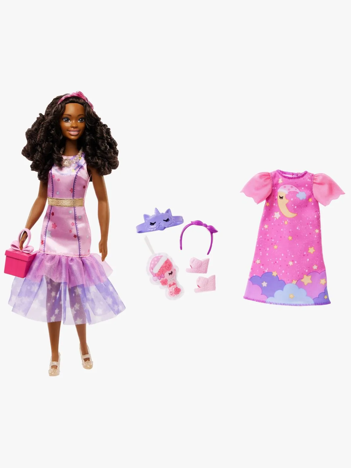– Indeholder: 1 dukke, 1 hundehvalp, 2 outfits, 2 diademer, 1 dukkehårbørste, 2 par sko, 1 sovemaske, 1 gave, 1 halskæde.