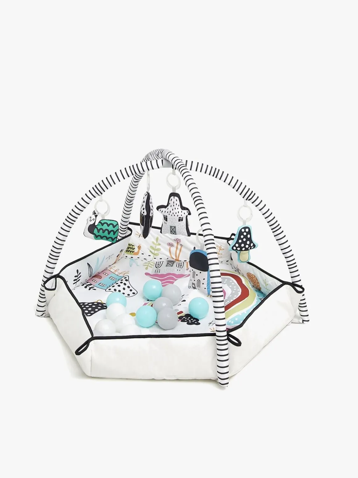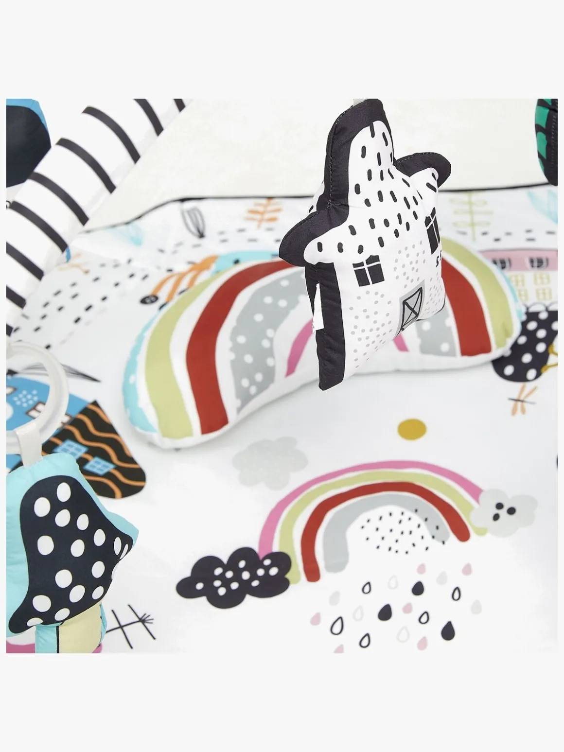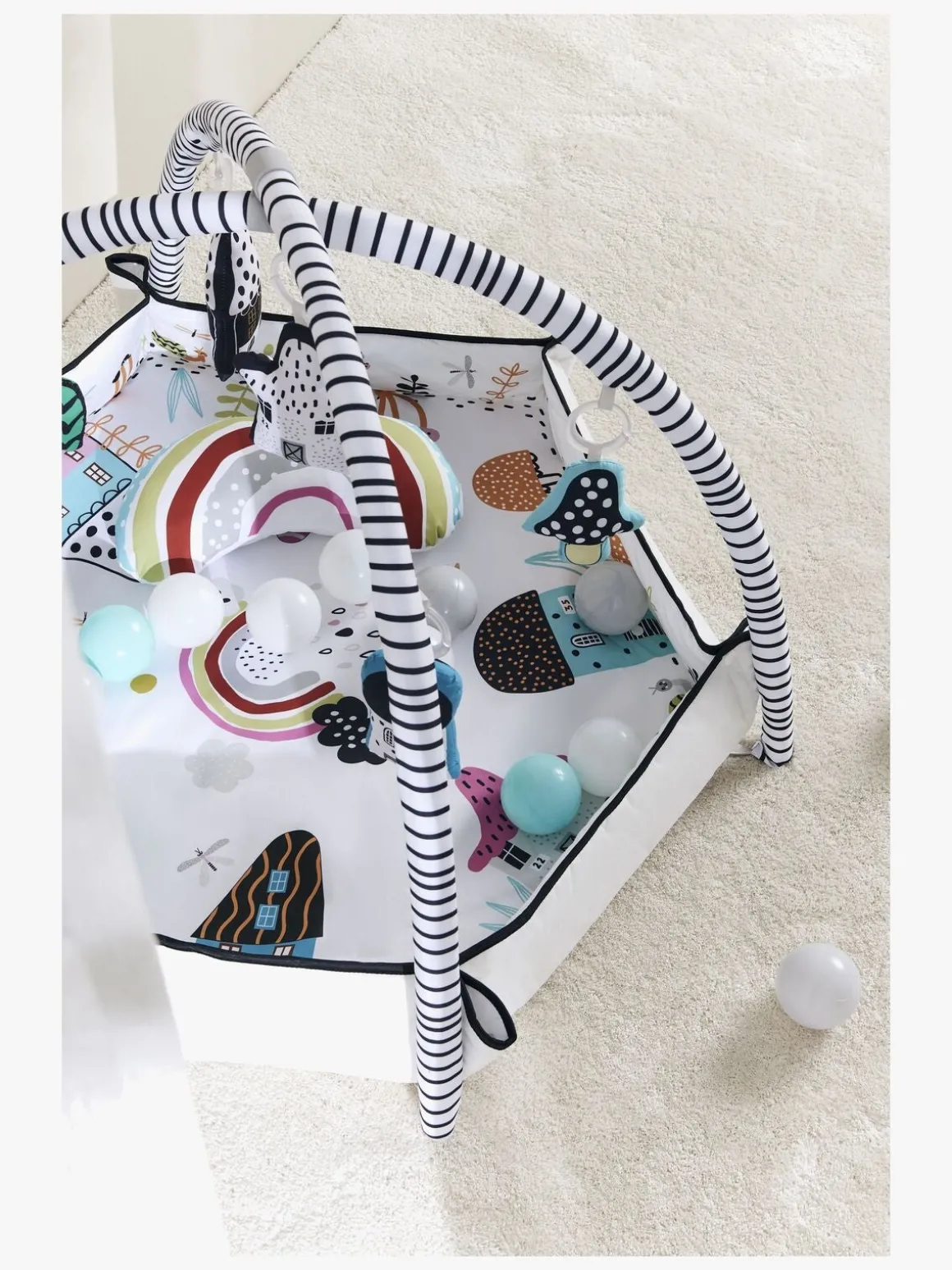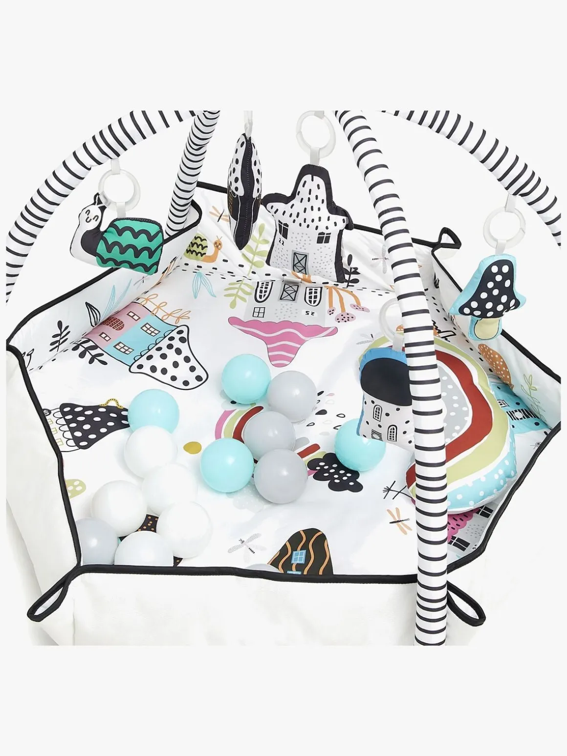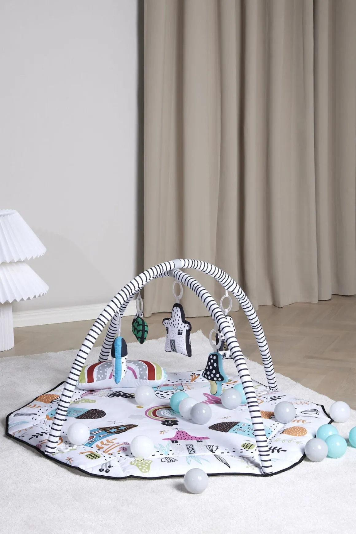 – Legetilstande: Liggende, mavetid, siddende, boldbassinleg, on-the-go barnevognslefetøj.