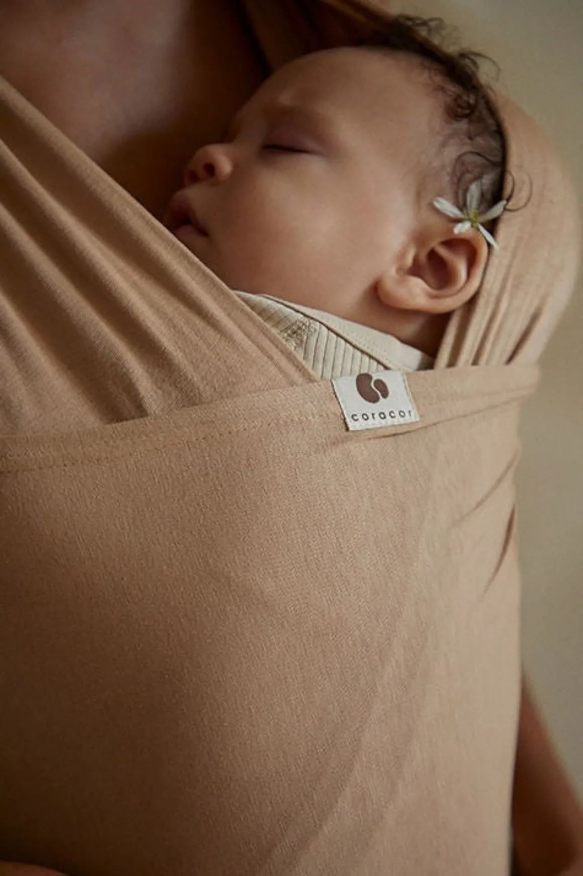 Coracors strækvikler har tovejsstretch, der gør den føjelig og aflastende. Viklen er fremstillet af blødt, økologisk GOTS-certificeret bomuld, men en smule elastan, for at gøre den mere føjelig. Dette materiale er åndbart og holder både dig og dit barn tilpas varm.