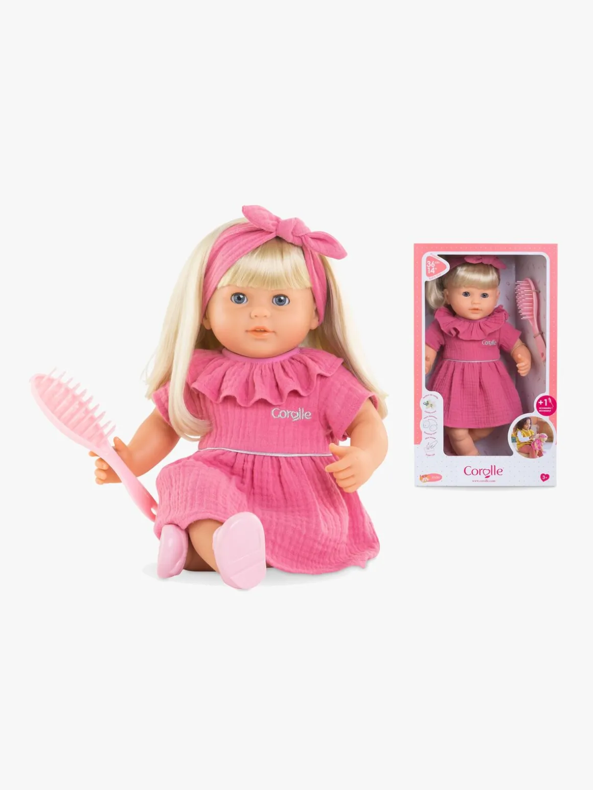 – Dukken er klædt i en lyserød kjole, med pandebånd og matchende ballerinasko.