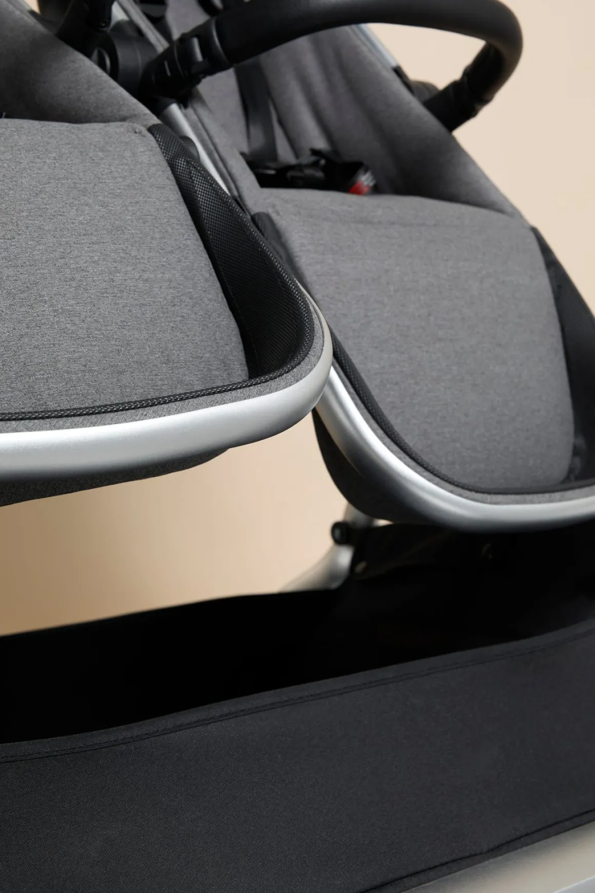 Selv teleskophåndtaget er dækket af behageligt, imiteret læder og det kan justeres så det passer til personen, der kører vognen. Der er fodbremse og en stor opbevaringskurv under vognen. Stellet har fire punkteringsfrie EVA-hjul, hvoraf de to forreste kan låses. Du kan tilkøbe lufthjul (sælges separat).