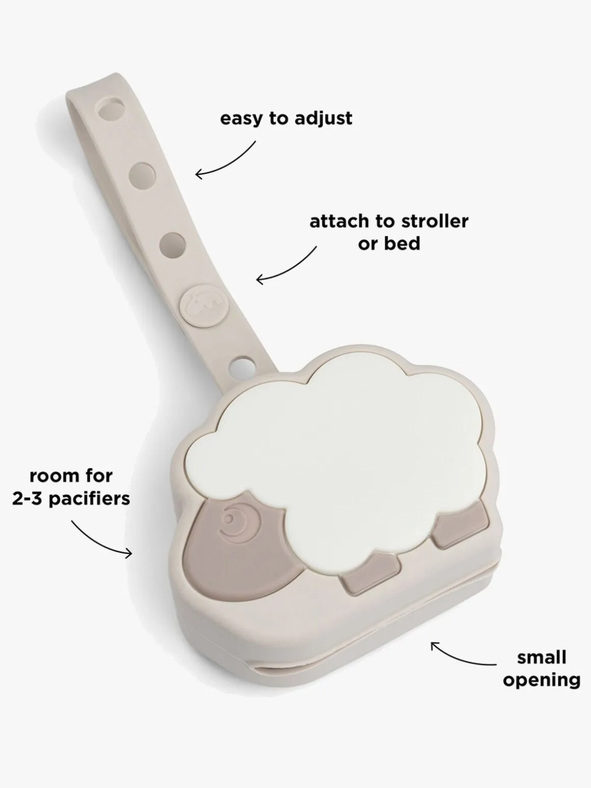 – Silikonerem til at sætte på barnevogn, pusletaske eller vugge.