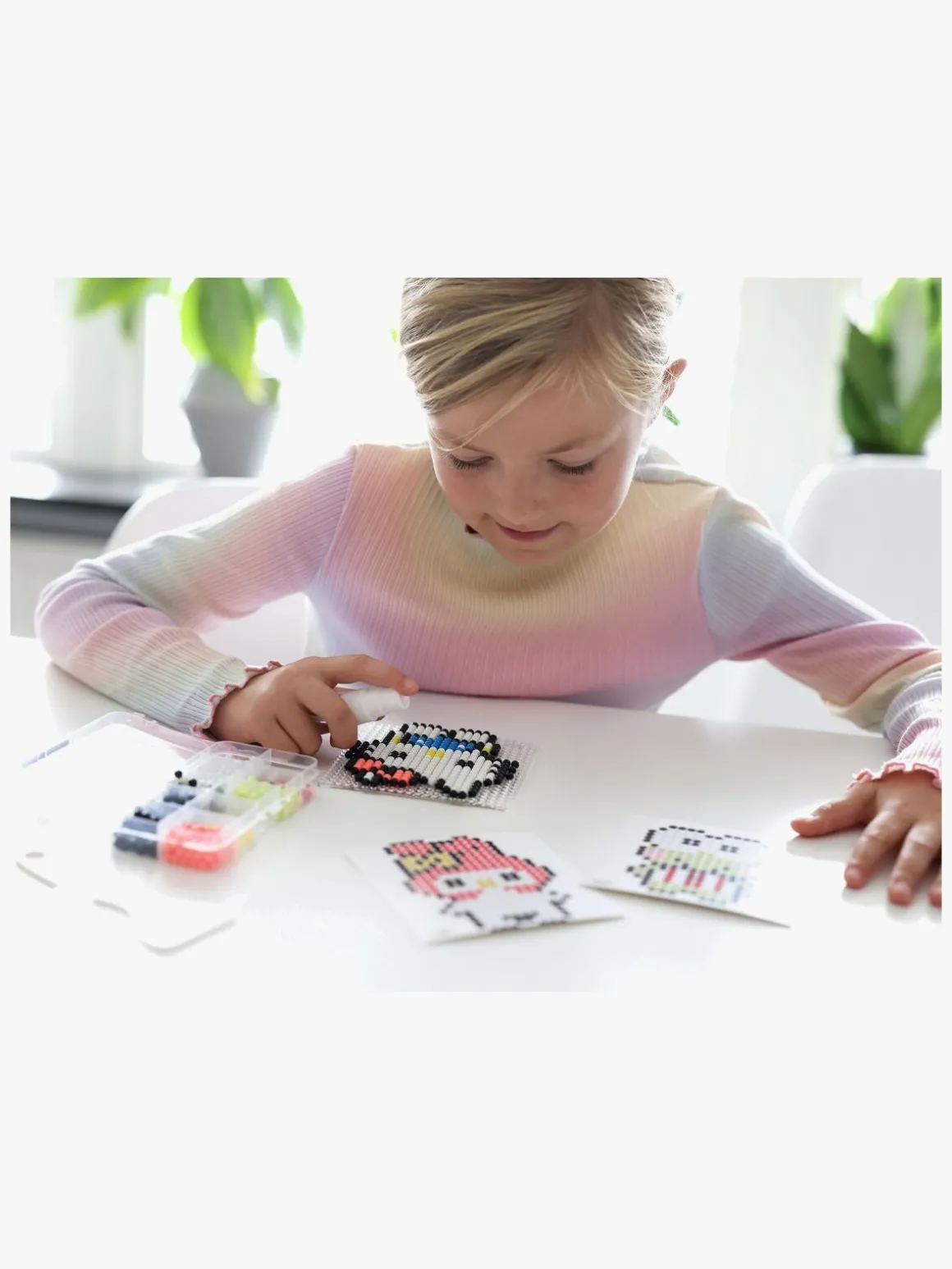 – Placer perlerne på pladen, spray med vand, vent, og så er kunstværket færdigt.