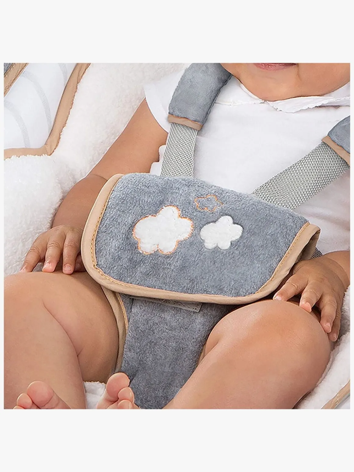 Betrækket er fremstillet af blødt stof og sikkerhedsselen er betrukket med fleece, så dit barns følsomme hud beskyttes. Den medfølgende nakkestøtte skaber mere stabilitet og gør det ekstra behageligt for de mindste børn og kan tages af når barnet bliver større. Skråstolen kan pakkes sammen, når den skal opbevares eller transporteres.