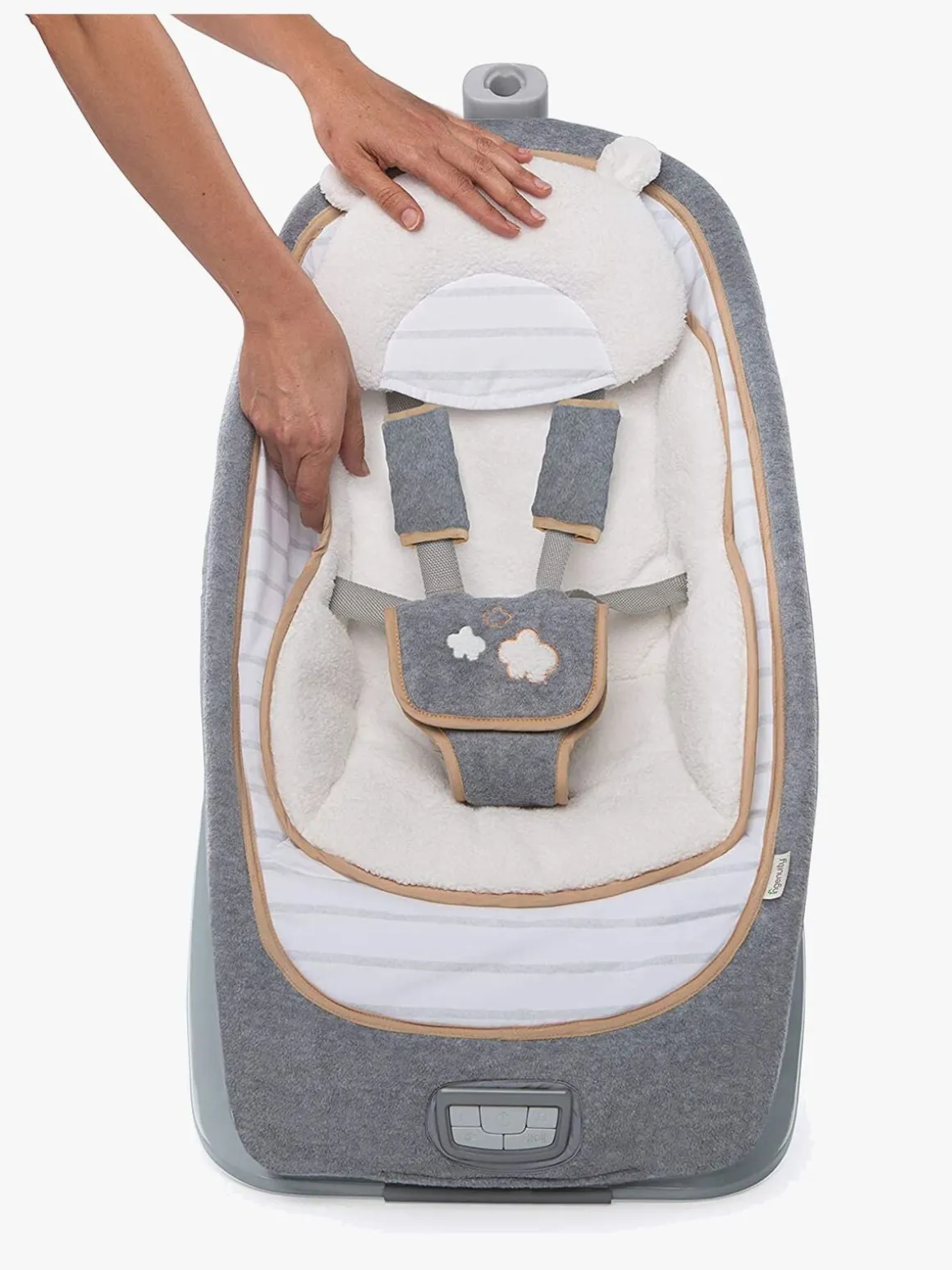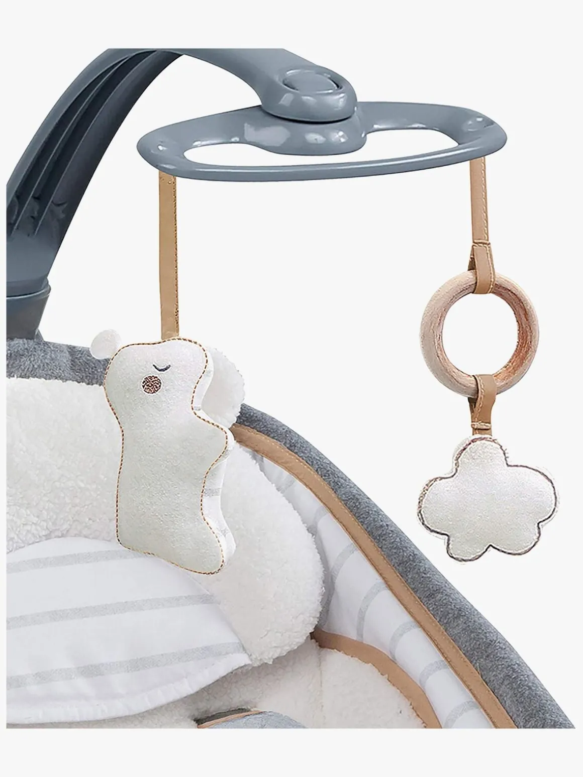 Skråstolen kan gynge frem og tilbage, samt laves om til en stationær stol med beroligende vibrationer, naturlige lyde og musik. Legetøjsbøjlen kan tages af, så dit barn har en behagelig gyngestol, når det bliver ældre.