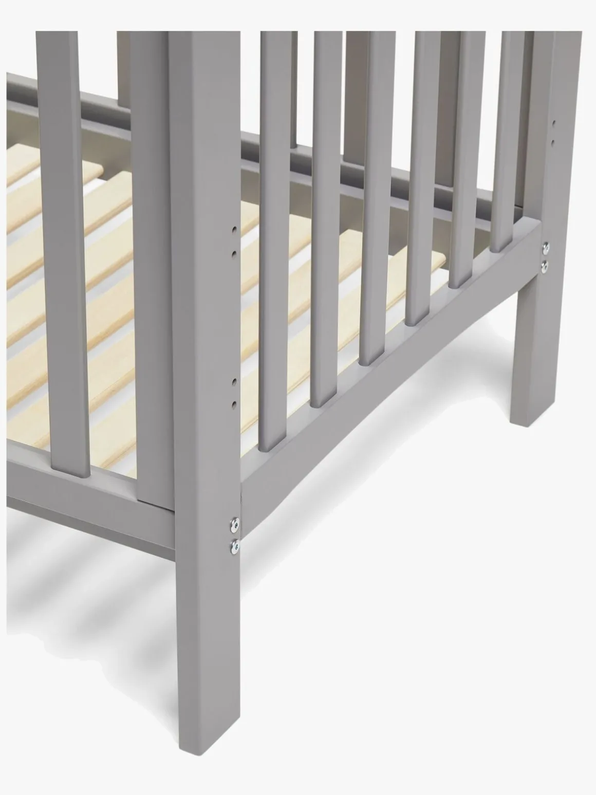 Justeringen af den lange side er børnesikret og kræver, at du løsner den nederste kant, før du løfter den. Du skal blot skubbe den lidt ind med foden og løfte lige op. Rib-bunden har desuden to faste positioner, hvor dropside-funktionen ikke kan bruges.