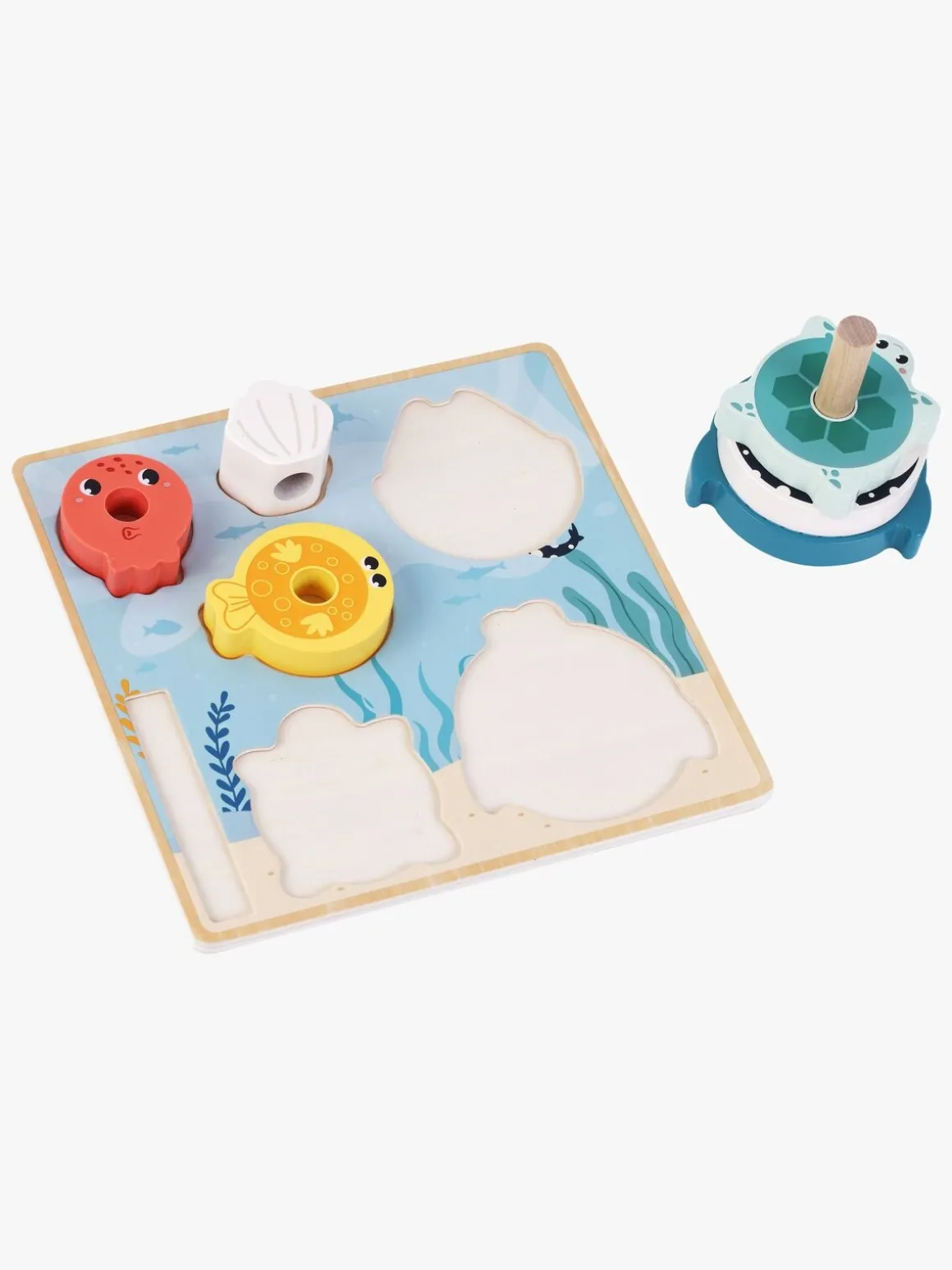 – Indeholder: 6 brikker med huller i midten og en træpind til at stable dem på.