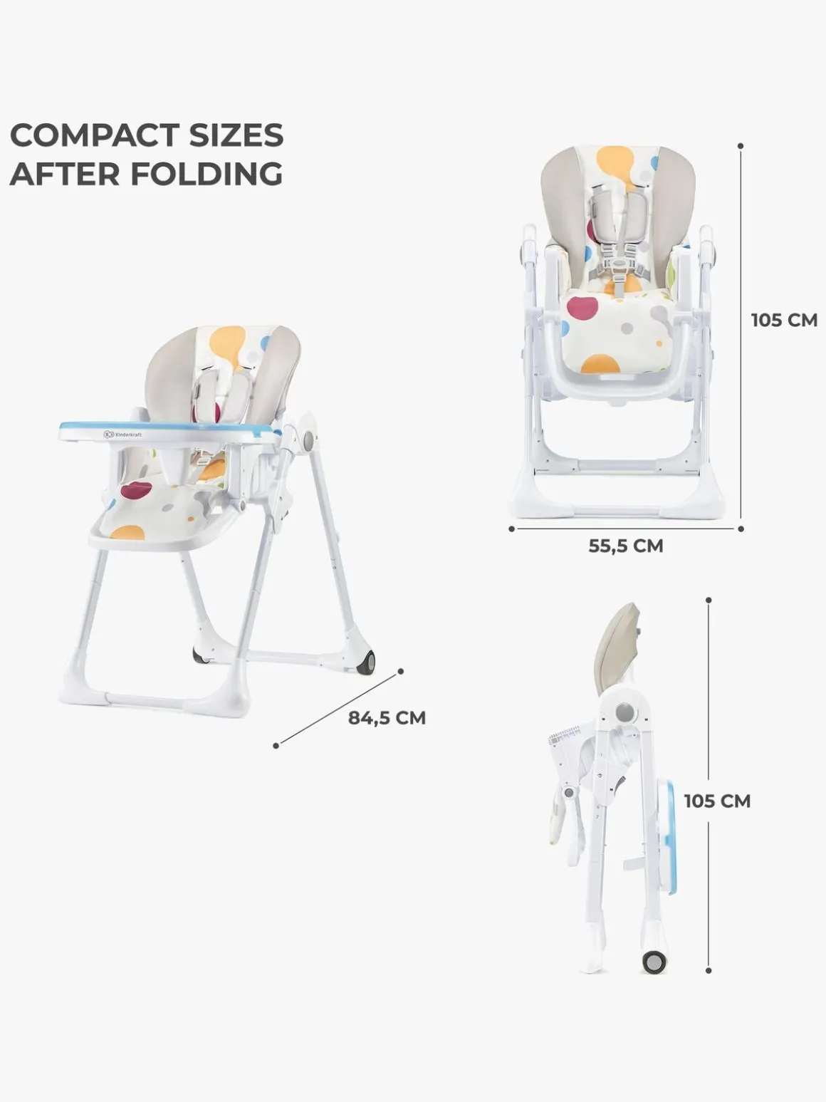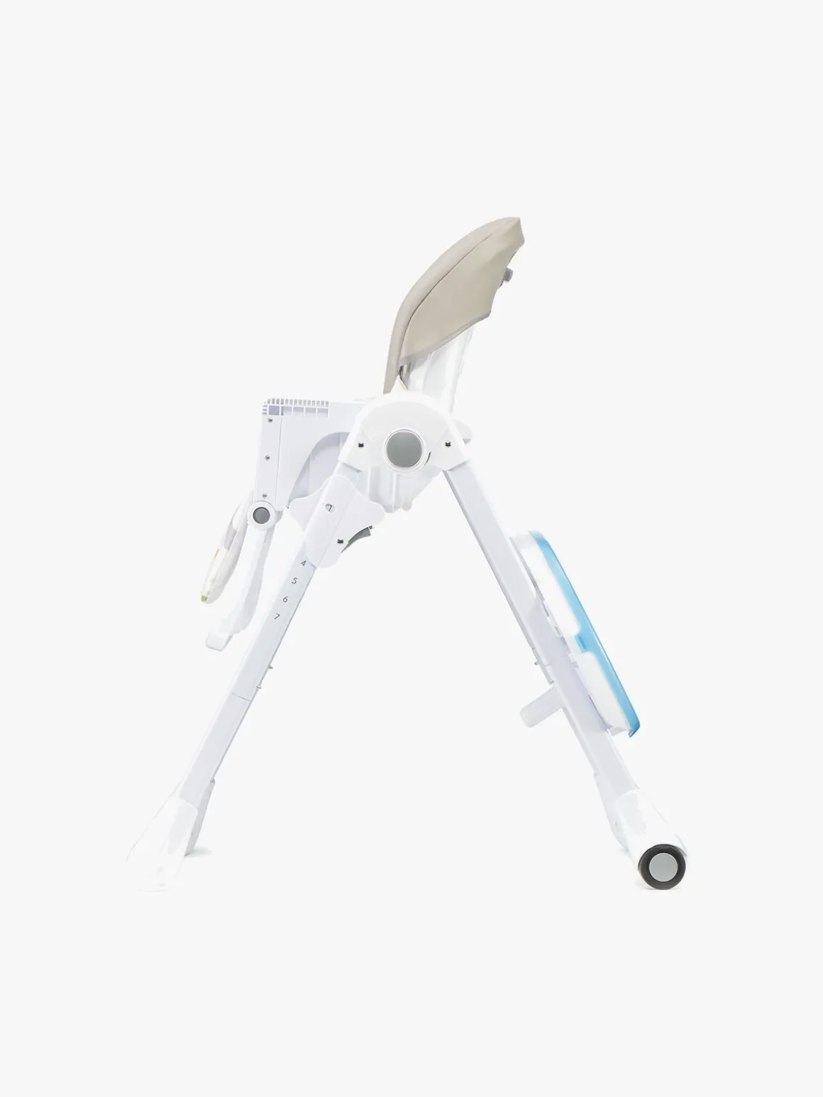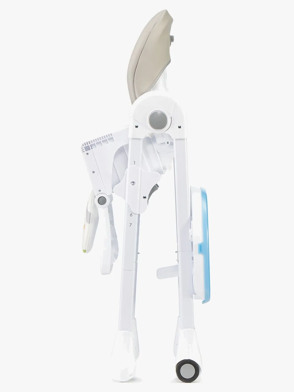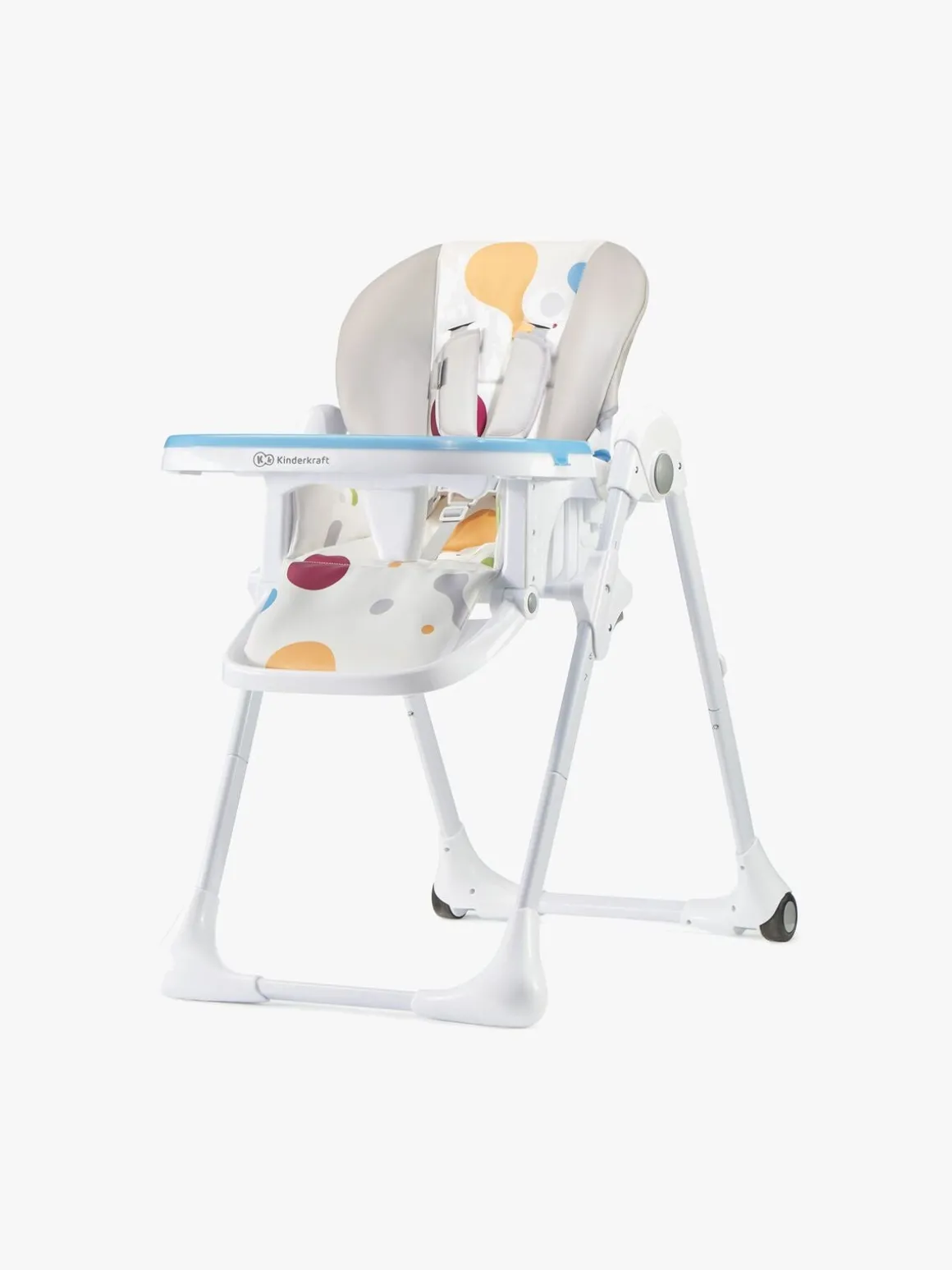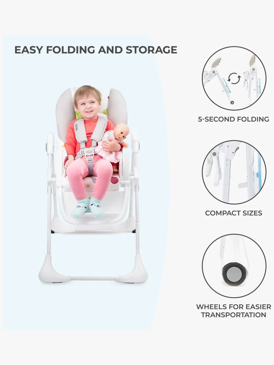 Højstolen er let at sammenfolde og opbevare, når den ikke bruges. De forreste ben har skridsikre puder og de bagerste hjul, så stolen er let at flytte.