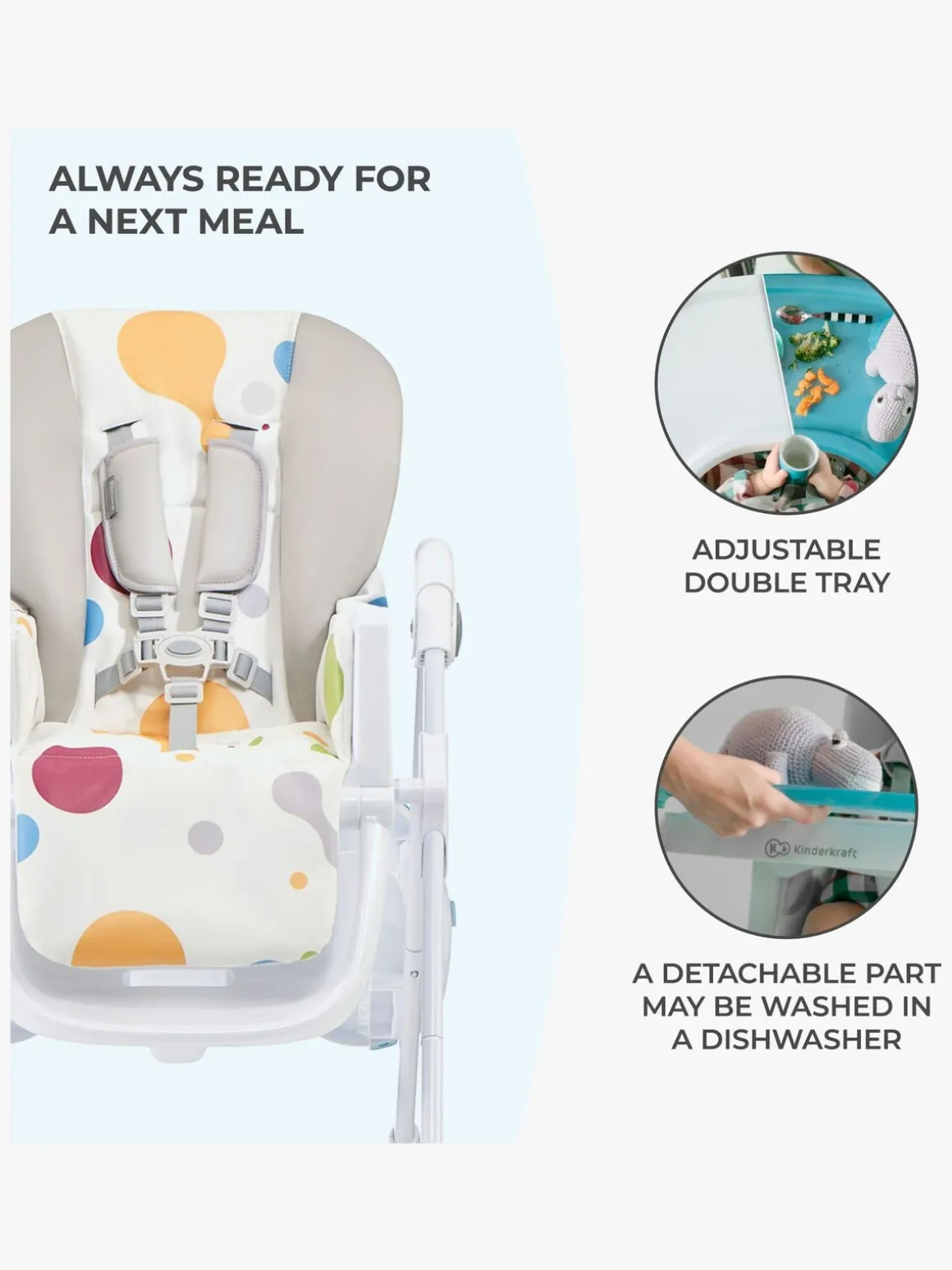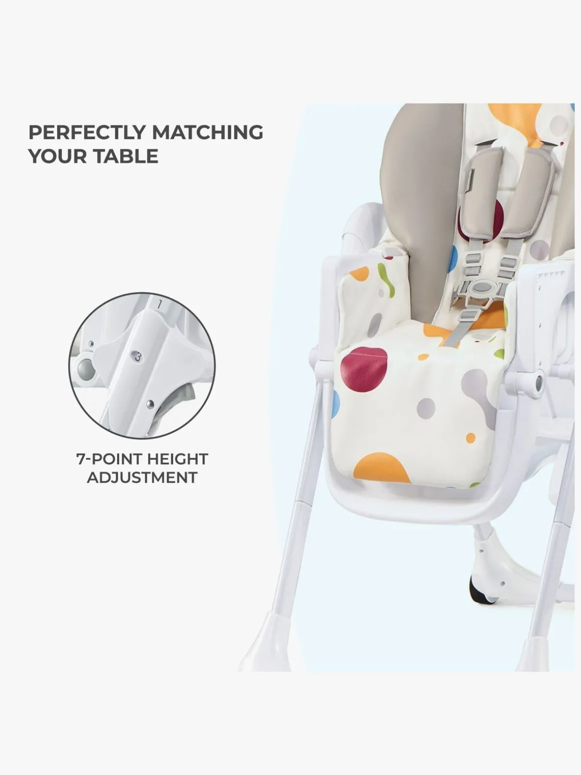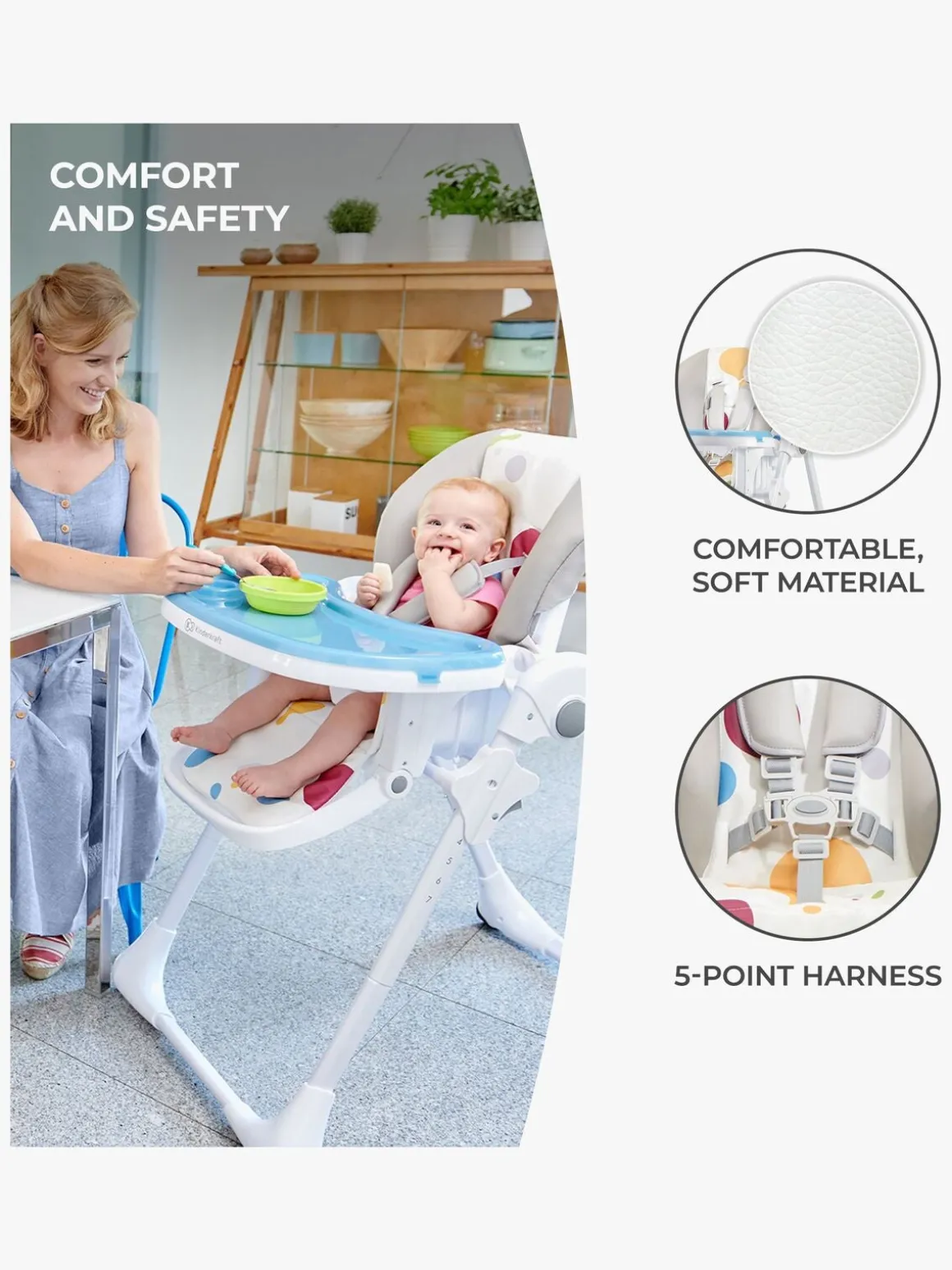 Siddefladen er fremstillet af kvalitetslæder og et vaskbart stoflag, så dit barn kan sidde godt samtidigt med at sædet er let at rengøre. For yderligere komfort kan både ryglæn og bakke justeres i tre forskellige indstillinger. Fodstøtten kan også foldes op eller ned og sædet har syv forskellige siddepositioner. Fempunktsselen sikrer at dit barn vil sidde sikkert i stolen og den kan fjernes ved rengøring.