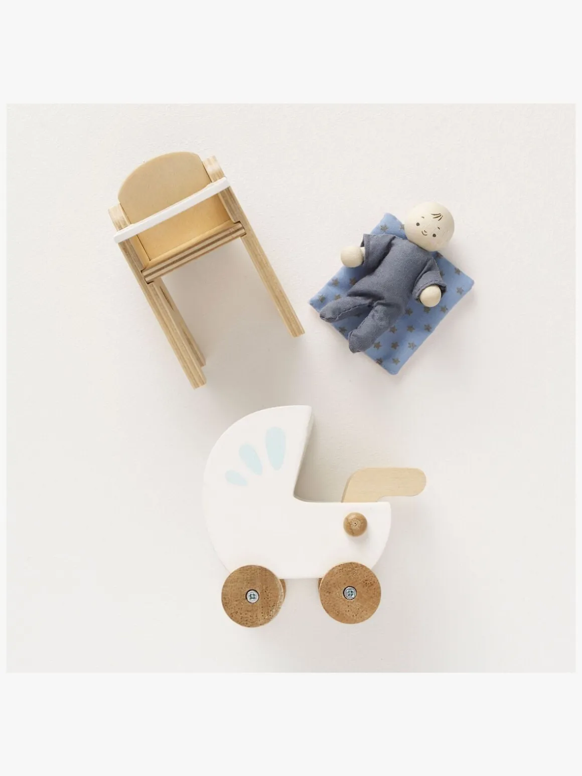 – Indeholder: 1 barnevogn med et tæppe, 1 højstol med en hagesmæk, 1 baby.