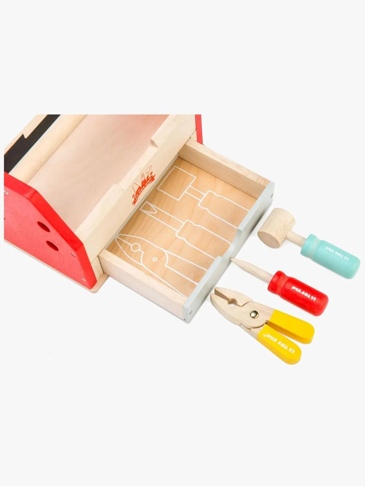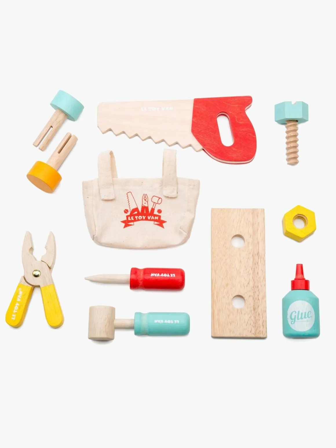 – Indeholder: 1 værktøjskasse, 4 værktøjer, 2 søm, 1 skrue, 1 bolt, 1 bræt, 1 limflaske.