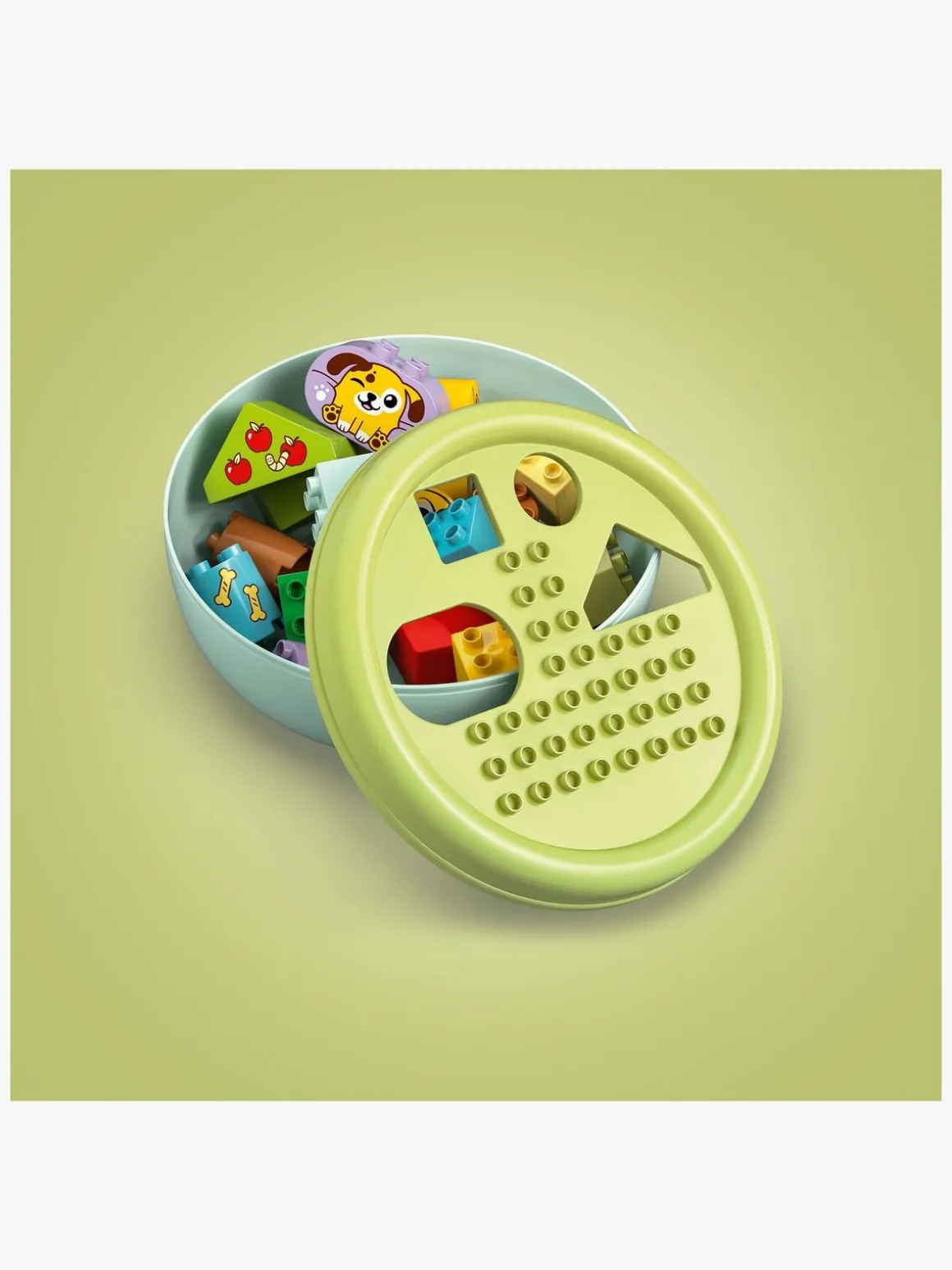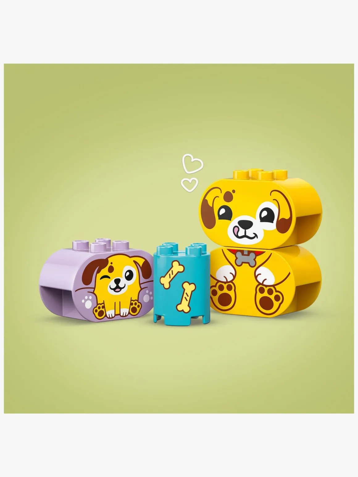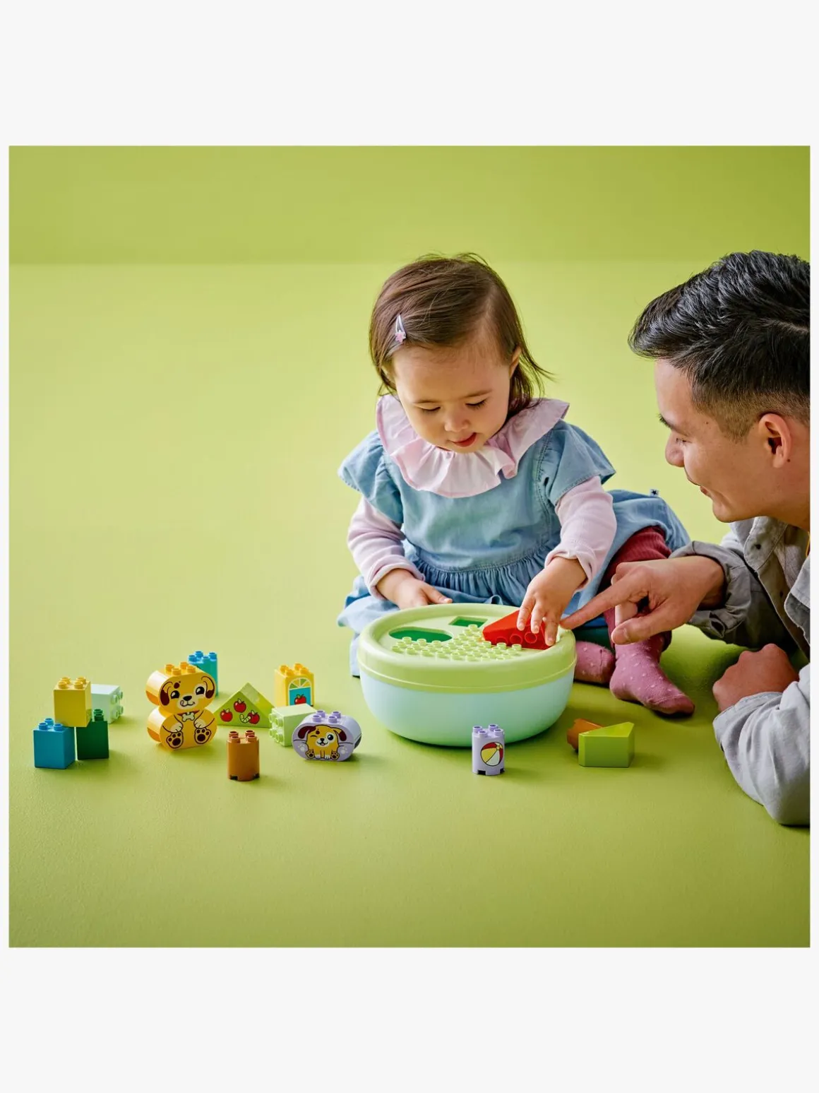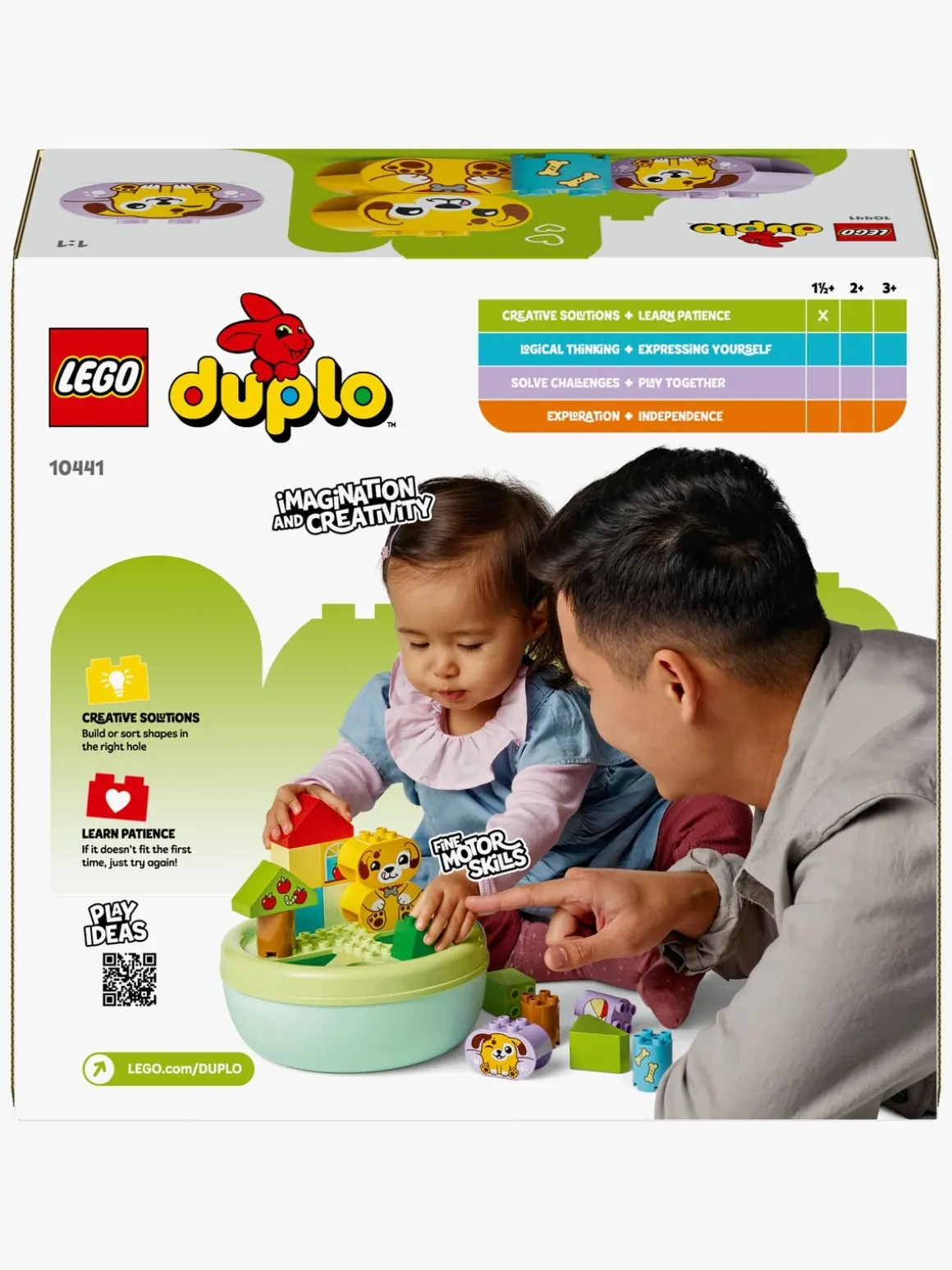 En legetøjsgave til tumlinger, der styrker den rumlige orienteringsevne og er fyldt med sjove læringsaktiviteter for familien. Forældre kan udpege formerne i sættet, mens de små bruger dem til at bygge træer, hundefigurer og et hus. Derefter kan de nyde kreativ rolleleg med deres søde LEGO DUPLO legetøjshunde, trille en bold til dem og give dem et kødben.