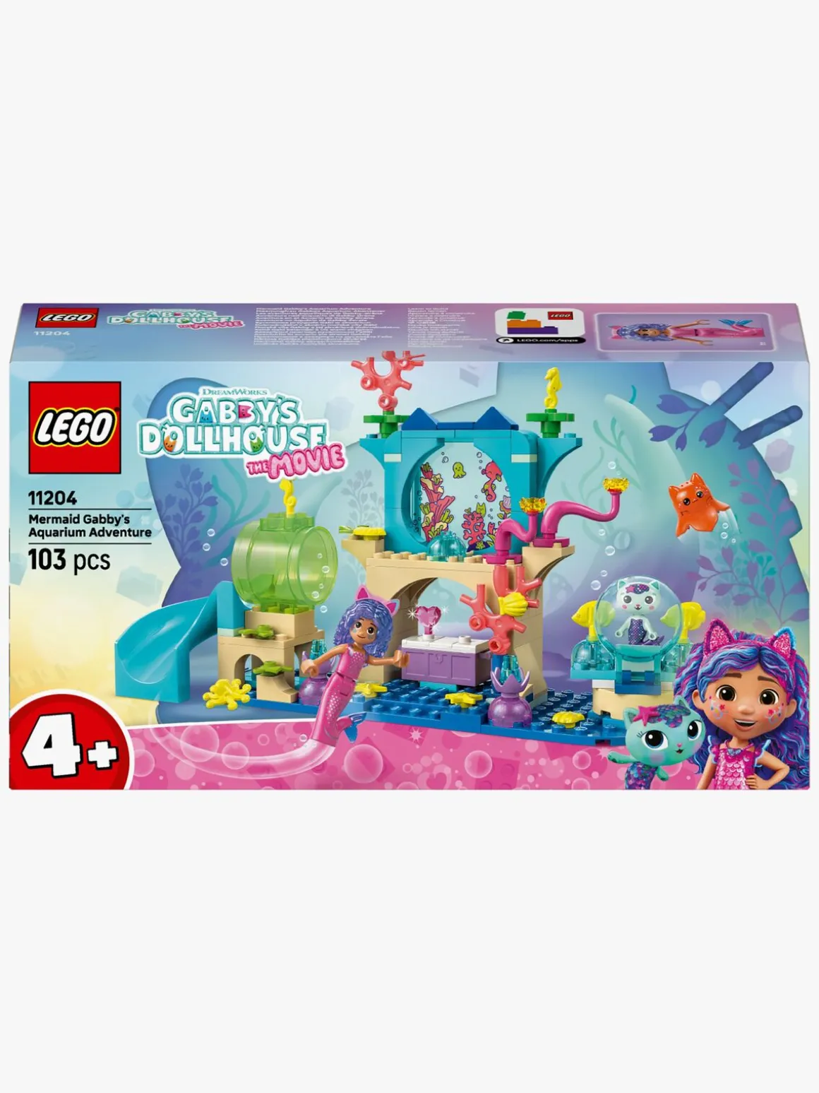 LEGO Gabbys dukkehus legesættet flyder over af farverige detaljer og velkendte karakterer, bl.a. en Gabby-minidukke i sit havfruekostume og figurer af Havkat og Gople. Børn kan sammen med Gabby og hendes venner udforske et farverigt undervandsmiljø fyldt med skaller, planter og havvæsner. Der er masser at opdage, f.eks. en rutsjebane, en kæmpe boble, som Havkat kan “flyde” i, og koraller, der kan flyttes for at afsløre en skjult skattekiste. Byggesættet indeholder farverig billedvejledning, en stor startklods og separate poser med 1 byggemodel i hver pose, så det kreative byggeri er hurtigt og sjovt for små byggere.