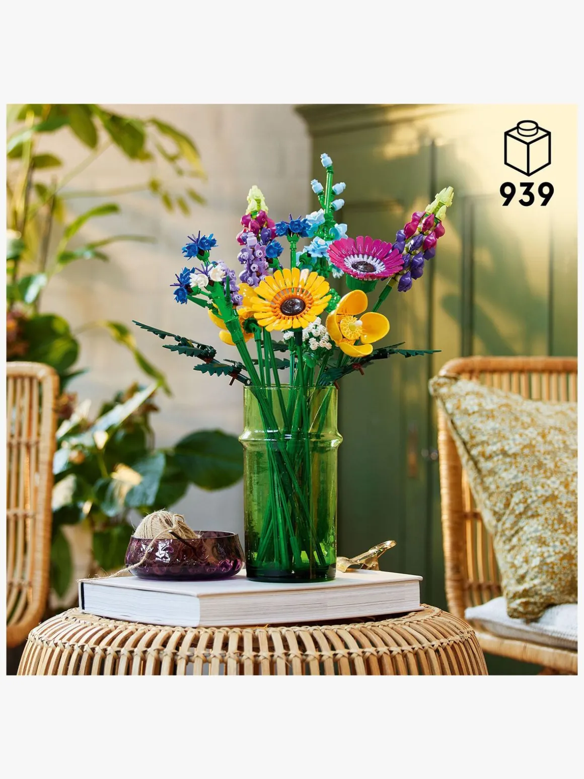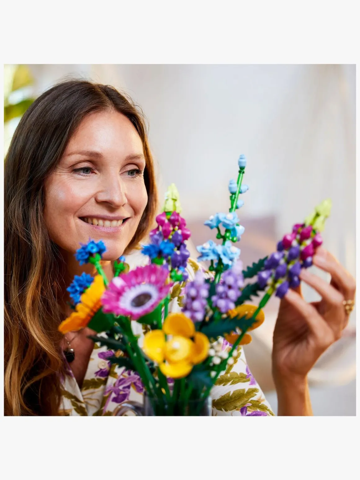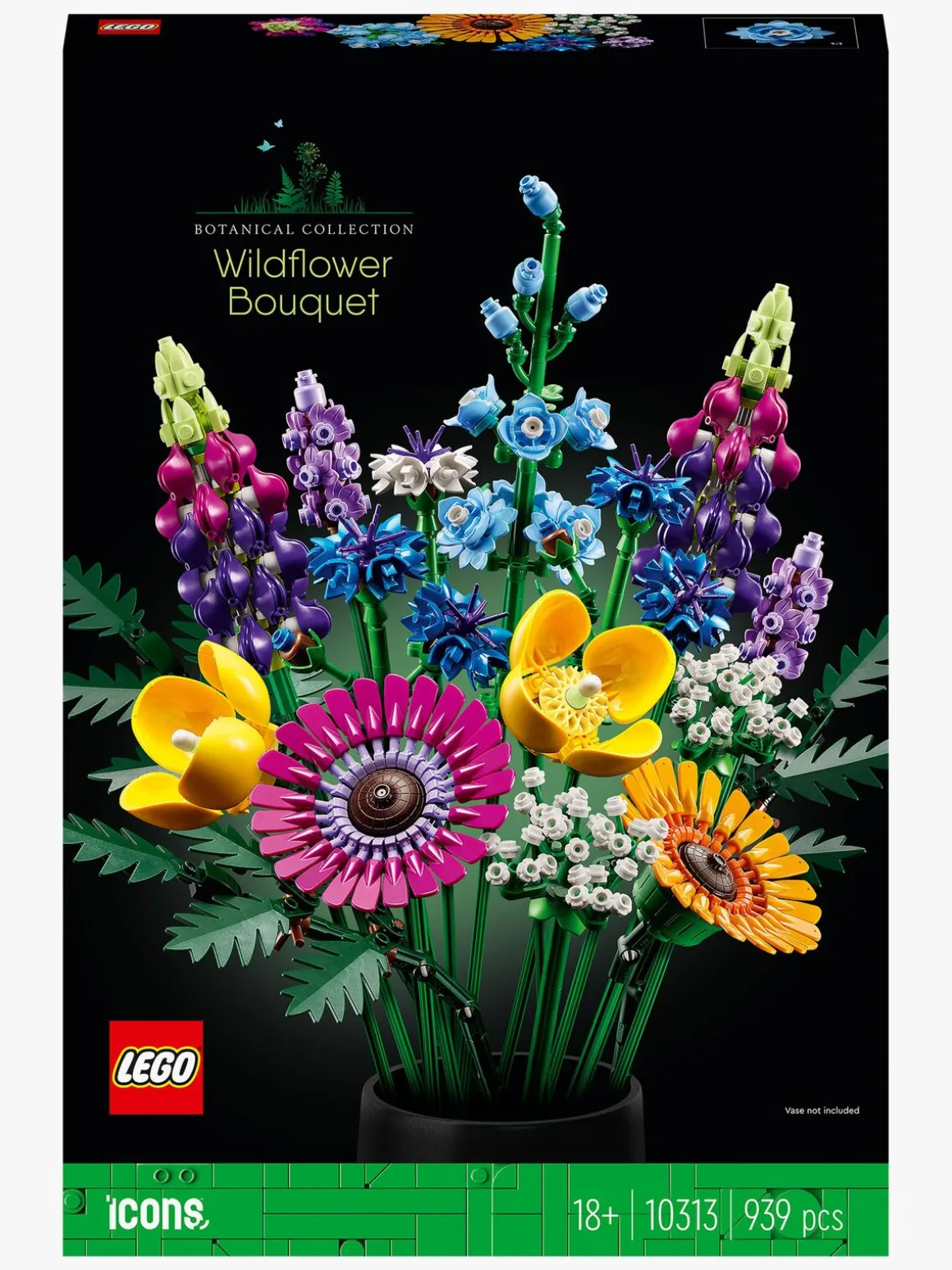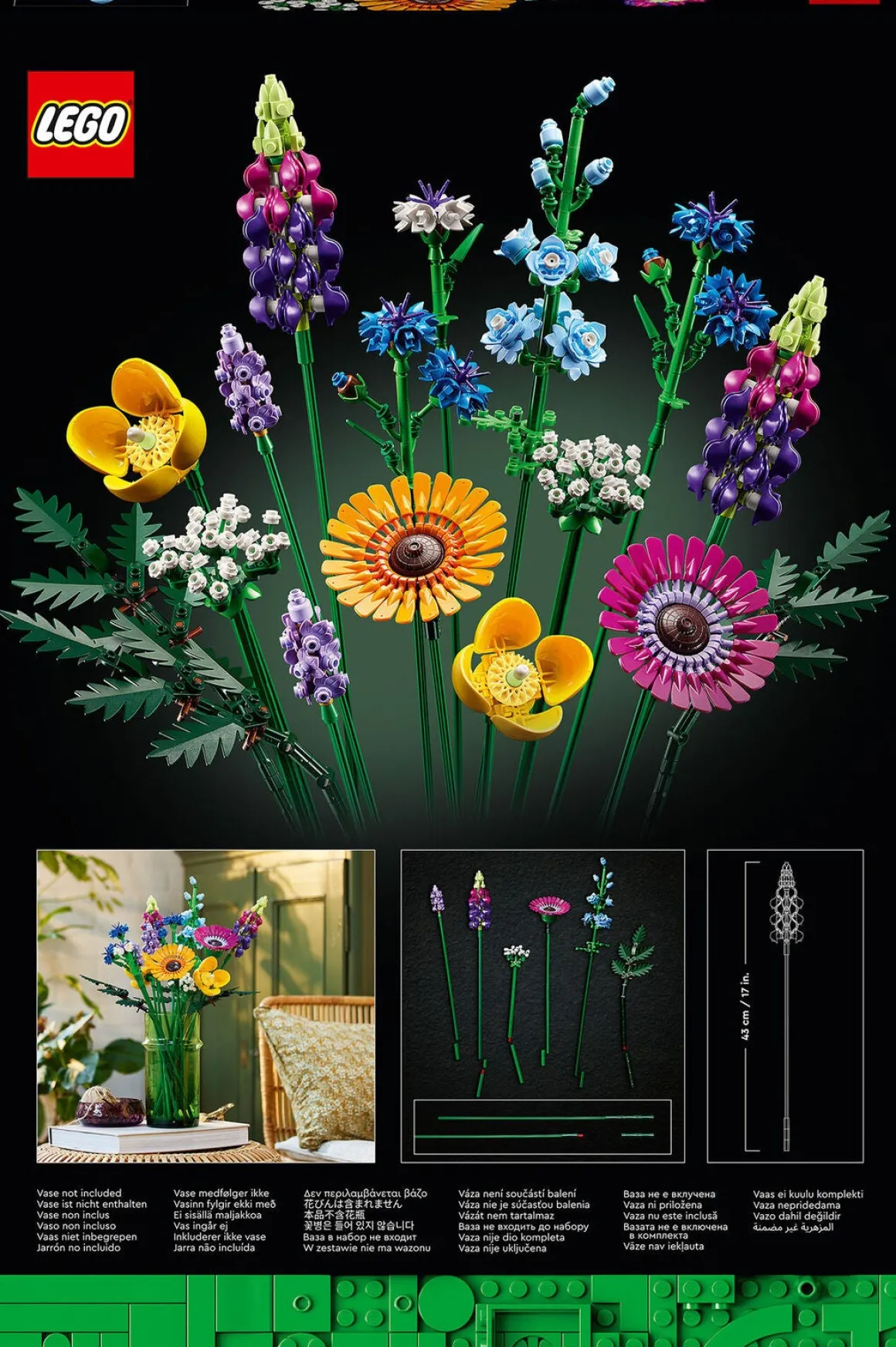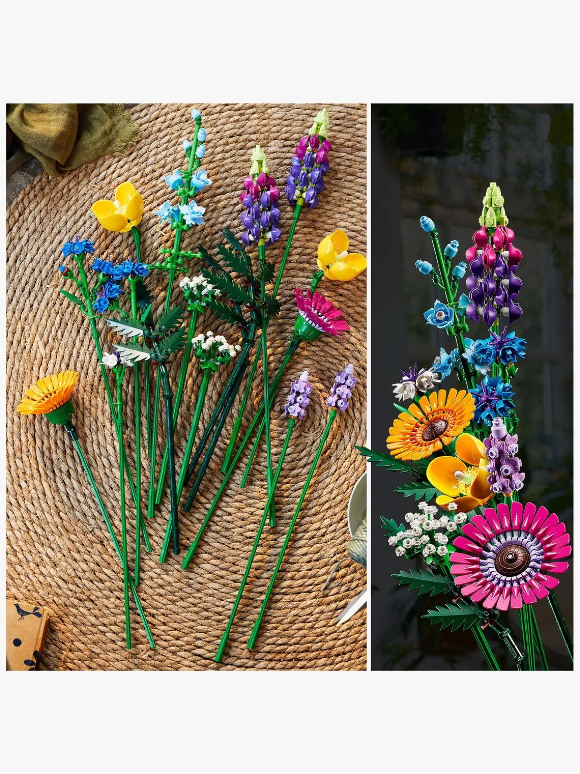Buketten er lavet udelukkende af komplekse LEGO elementer og indeholder 8 arter af vilde blomster på justerbare stængler. Spirende blomsterhandlere og blomsterelskere kan bruge timevis på at bygge og identificere blomsterne, der er inspireret af kornblomst, lavendel, skovvalmue, vild kørvel, læderløv, gerbera, ridderspore og lupin. Når LEGO blomsterne er færdige, kan de udstilles i en yndlingsvase og blive en iøjnefaldende del af boligindretningen, som vil få glæden til at spire, uanset hvilket rum de placeres i.