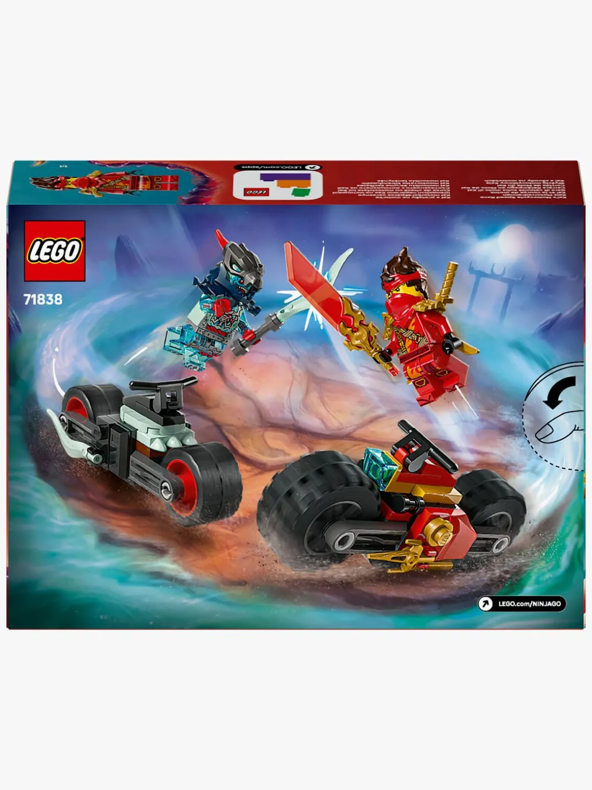Ninja-køretøjssættet indeholder 2 NINJAGO-minifigurer, der kan køre på motorcyklerne: Kai bevæbnet med en gennemsigtig klarsyns-klinge og 2 gyldne katana-sværd samt en dragonisk ånde-spejder med et sværd som tilbehør, så børn kan nyde fantasifuld leg alene eller sammen med venner, når de udspiller kampe mellem det gode og det onde.