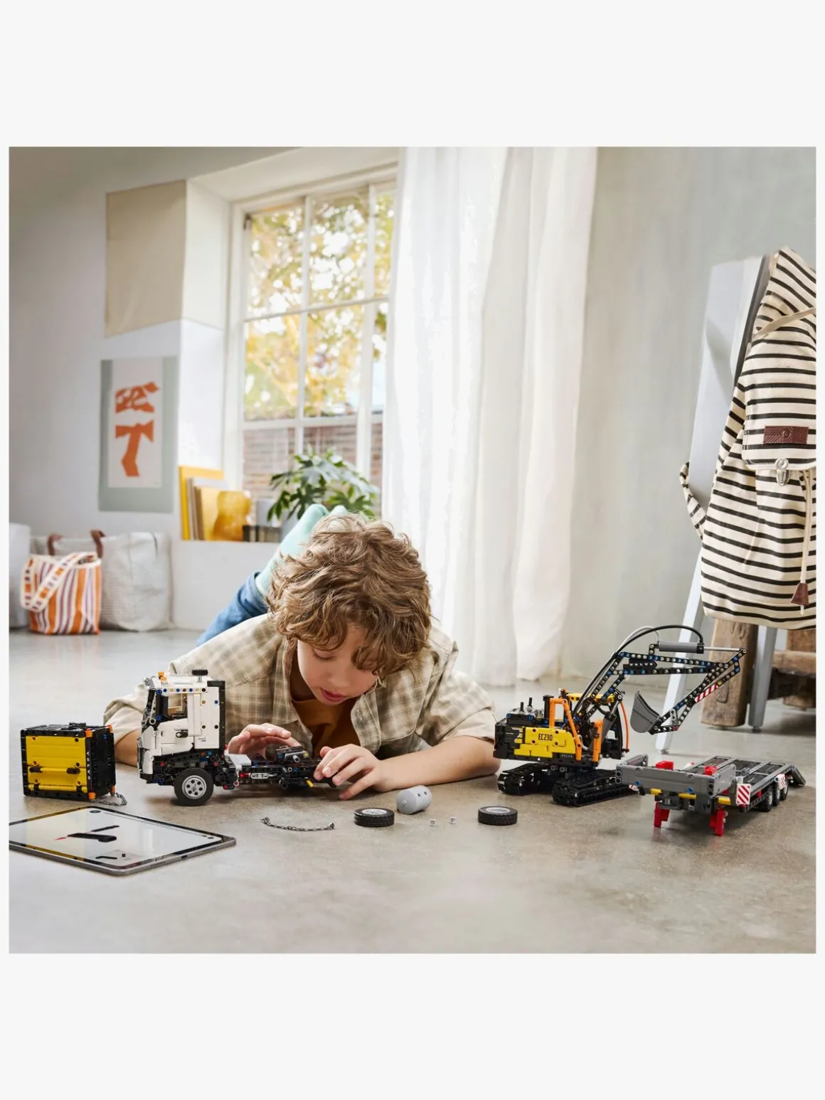 Unge byggere kan åbne LEGO Technic lastbilens døre og vippe førerhuset for at se den 6-cylindrede bevægelige stempelmotor. Så kan de styre legetøjslastbilen på plads, hægte anhængeren af og folde rampen ned for at rulle gravemaskinen af.