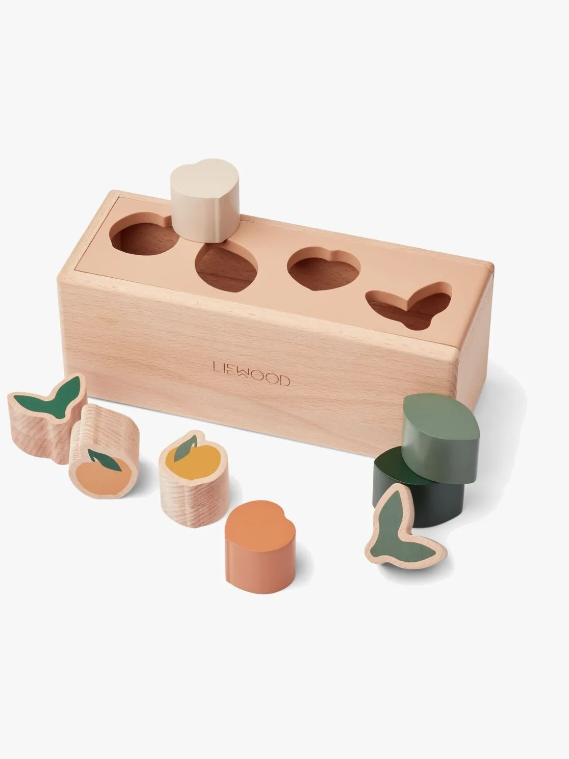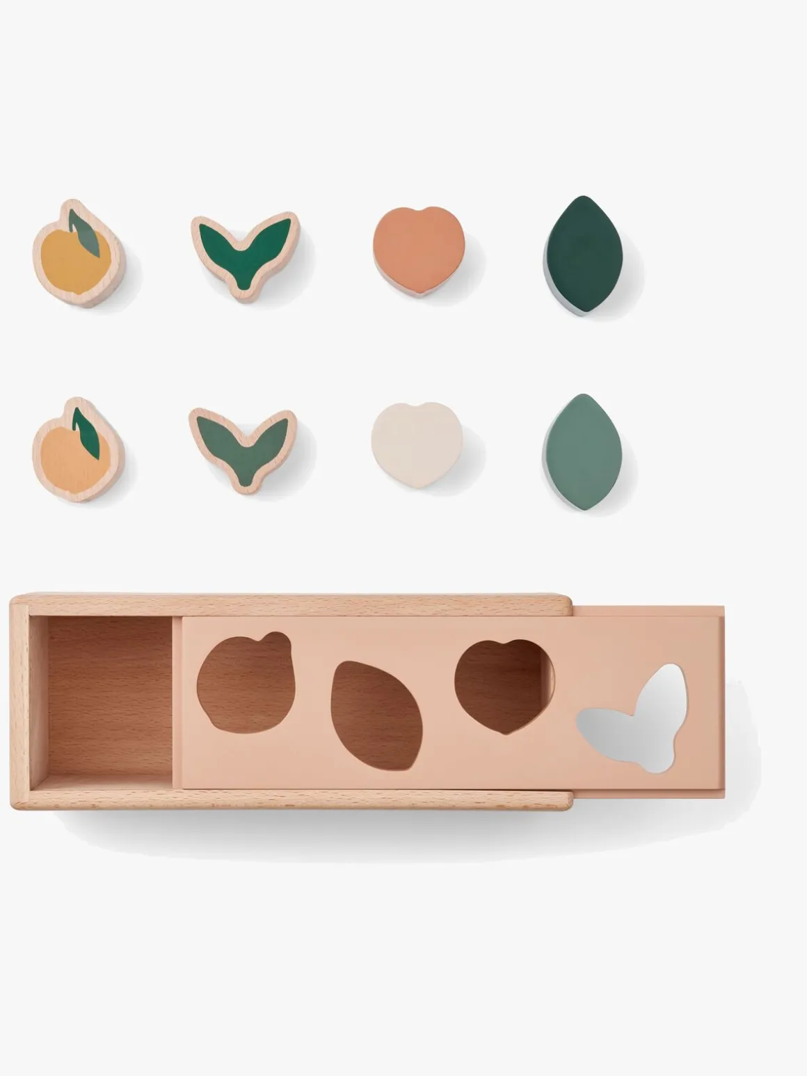 – Puttekasse med 8 træklodser i 4 forskellige former.