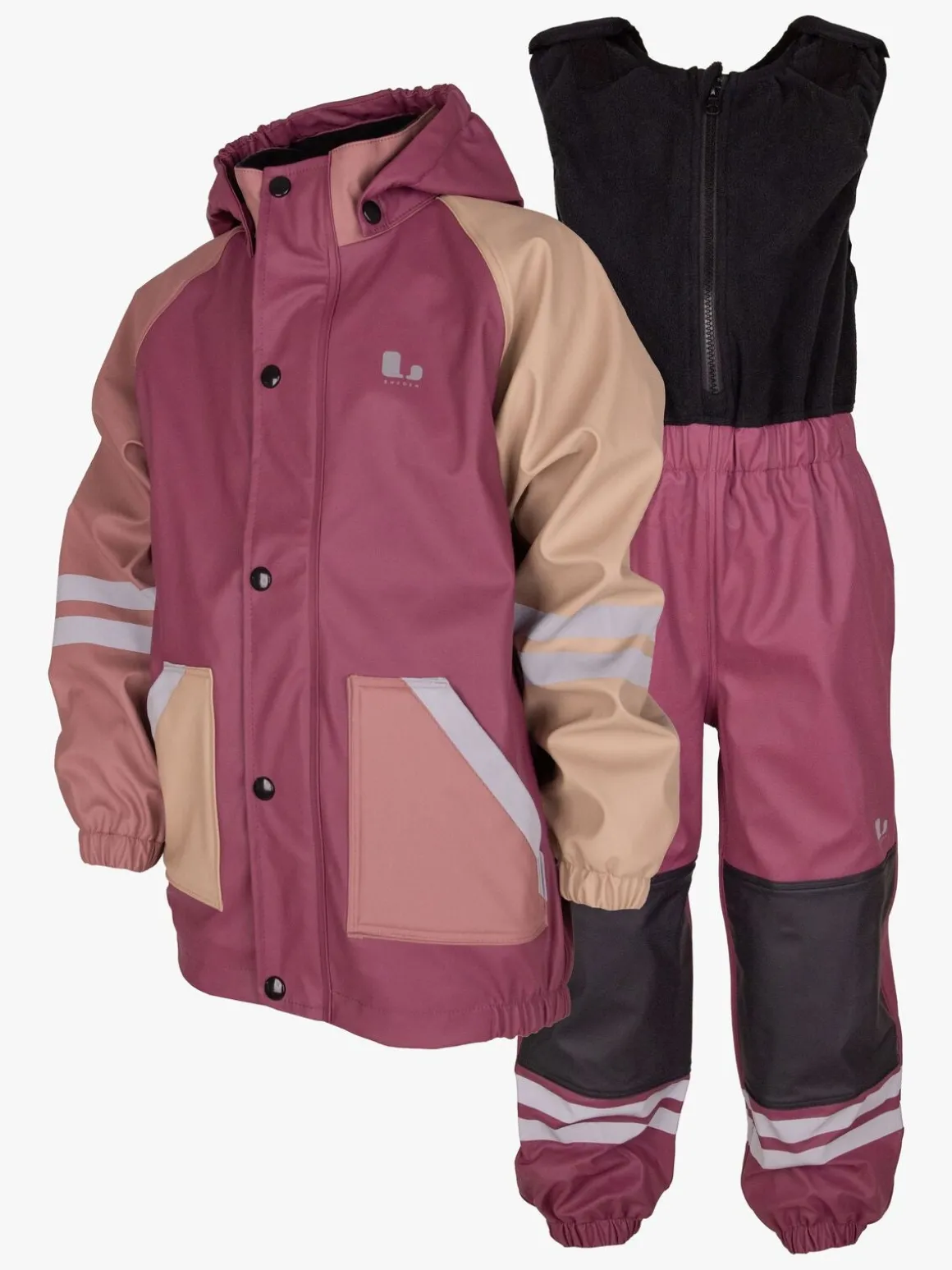 – Bukserne har en overdel i fleece, der dækker både bryst og ryg, og lukkes med velcrobånd ved skuldrene.