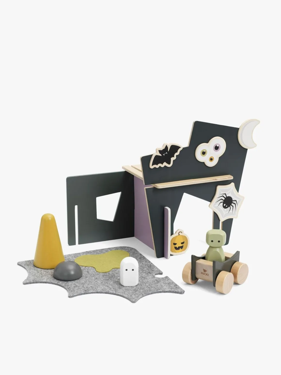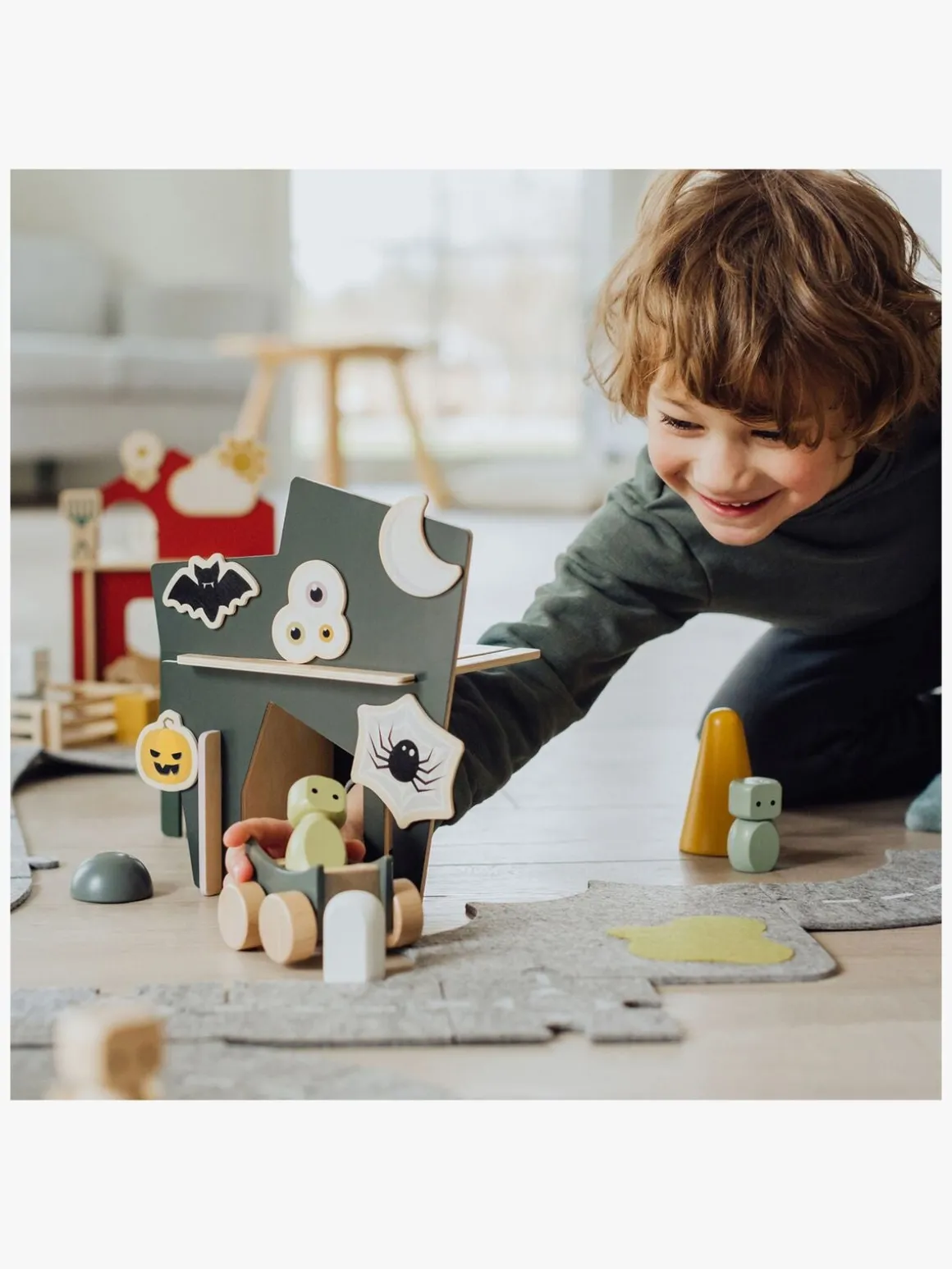 Måske begynder legen ved spøgelseshuset, men efterhånden som fantasien udvikler sig, kan verdenen vokse og blive noget helt andet. Denne legeverden indeholder: 4 vægge, 2 figurer, 1 sten/busk, 1 træ, 1 bil, 5 magneter (måne, flagermus, græskar, øjne og spindelvæv) og 1 legeplade af filt i 2 dele.