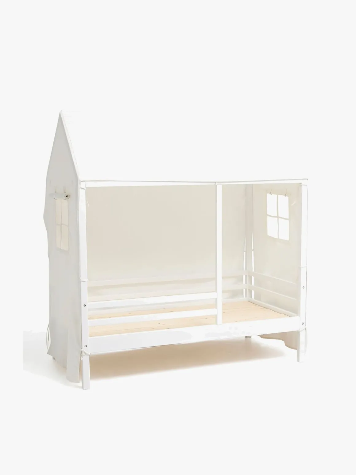 Denne juniorseng har høje sider, bortset fra en lille åbning i fodenden, så dit barn kan sove og lege sikkert. Den hyggelige sengehimmel fra Minitude har vinduer på de to kortsider. Siderne kan lukkes ved hjælp af velcro eller rulles op og bindes fast.
